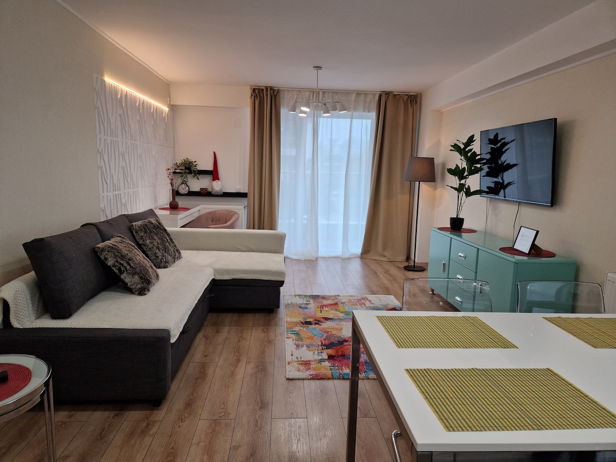 La Boheme Therme apartments, 5km away from Therme Complex, the biggest in Europe, have all the necessary facilities to make your family stay exceptional. With a modern air, the apartments have a bedroom with king size bed, bathroom completely equipped with washing machine, walking shower, towels, a living room with sofa bed, 4K Ultra HD Smart TVs with a 163 cm diagonal, open space kitchen completely equipped with microwave oven, an electric oven, stove, dishwasher , dressing room and balcony.
