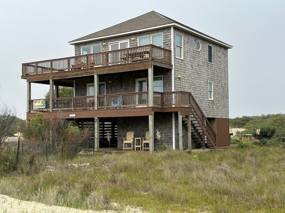 Awesome off road getaway! You will need 4 Wheel Drive (not awd) vehicle to access the property as there are no roads. Newer construction on the beach in Carova right next to the wild horse preserve. You will likely see horses on a daily basis! Home has 3 bedrooms and 3 baths with 3 deck areas to enjoy the ocean views, sunsets and breezes! Easy walk to the beach, parking passes included. New party deck with hot tub, grill, table, seating and string lights.
