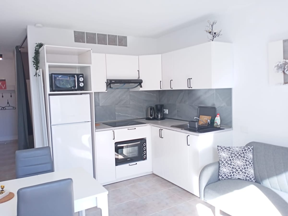 Charming studio apartment just 800 meters from the sea, with a welcoming and functional environment, suitable for a couple, soft colors and a modern setting. Comfortable double bed, equipped kitchen, small bathroom but with large shower, patio. Just 800 mg from the sea, 15 min from Las Americas, close to all the necessary services for a holiday, bus 100 meters away. Excellent wifi for smart working, with desk.