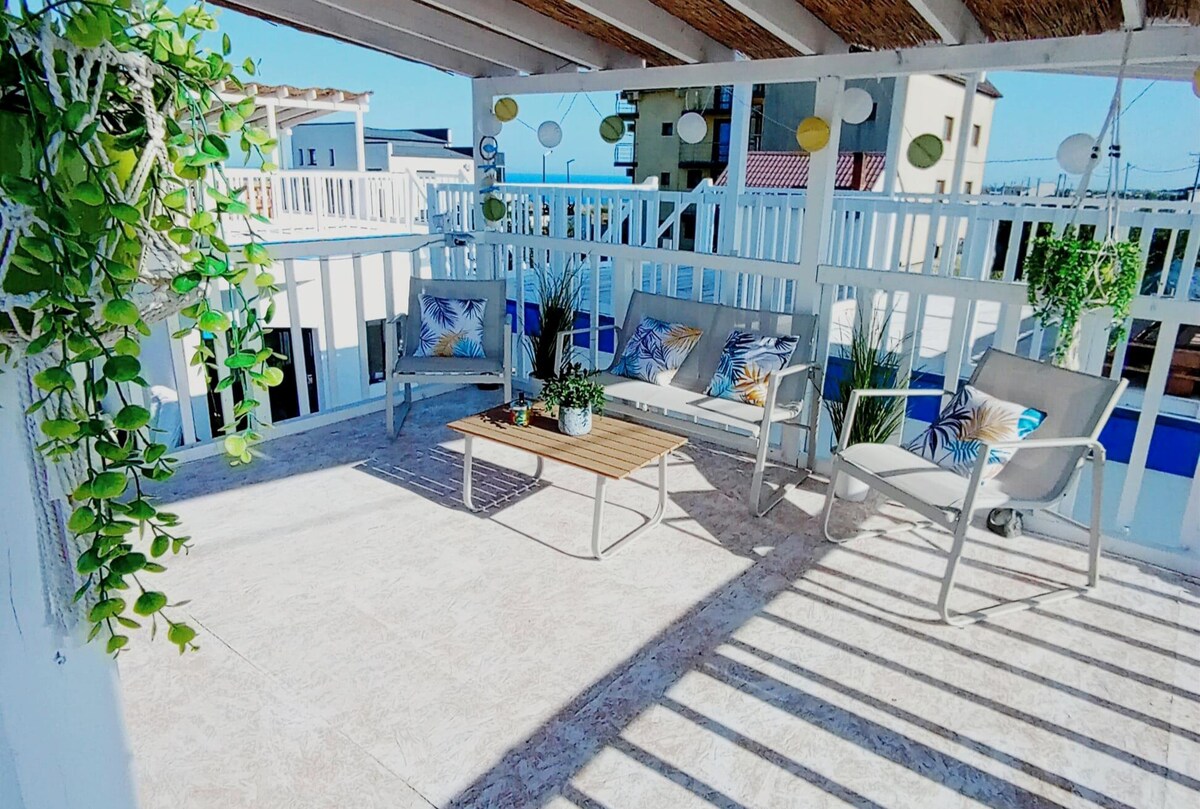 Sunshine Bungalow – Your seaside escape on Strada Sirenei 25, Schitu, Costinești. Sleeps 2–4. Enjoy a queen bed, 2 sofas, A/C, 58” Smart TV, dining area, and private bath. Relax on the rooftop terrace with sea view, BBQ, pool access, and golden sunset vibes. When night falls, your open-air cinema awaits — complete with a smart projector and automatic screen for unforgettable movie nights under the stars. Just minutes from the beach, yet wrapped in calm. Stay for the magic. 🌊🌌