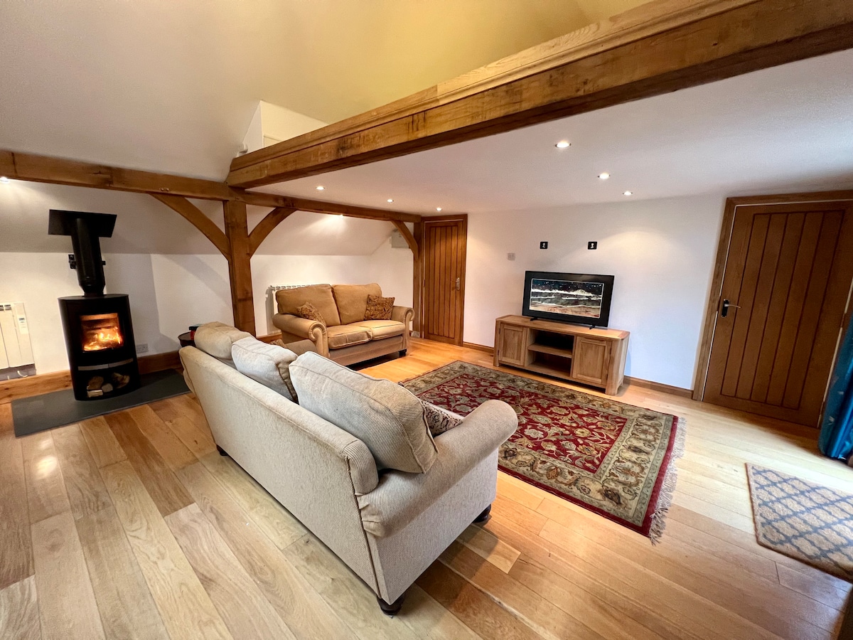 Prekrasna, skrovita, otvorena, šarmantna kočija s predivnim pogledom na šumovitu baštu i polja. Savršen romantični hrastov zrak ima novu dobro opremljenu kuhinju sa mašinom za sudove, mikrotalasnom rernom i retro frižiderom. Salon/trpezarija uključuje udoban gorionik, Wi-Fi, TV od43inča i Velux prozore. Spavaća soba sa bračnim krevetom ima velikodušan prostor od garderobe i suptilno osvetljenje. Moderno moderno kupatilo uključuje tuš, umivaonik i WC. Velika terasa ima trpezarijski apartman i hidromasažnu kadu.