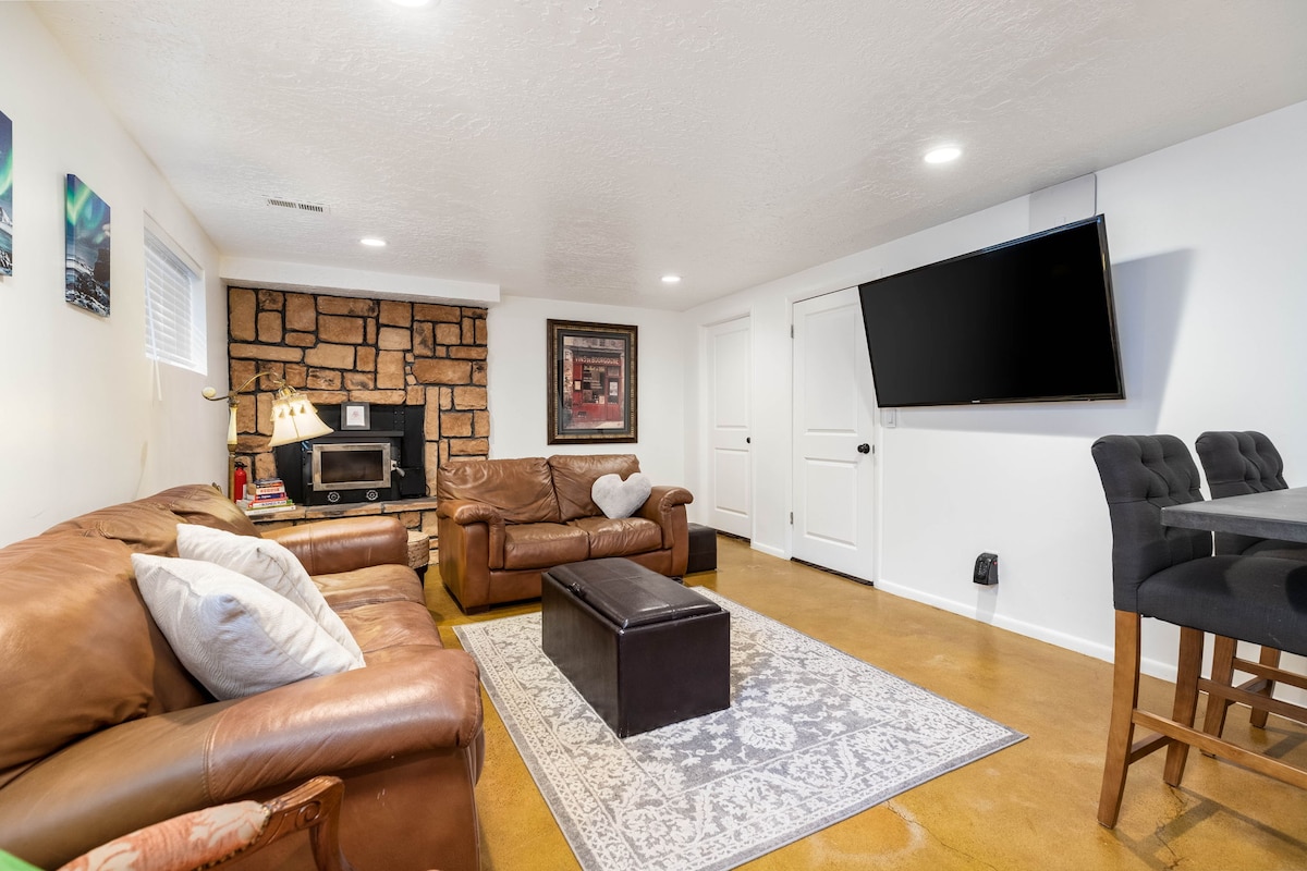 Otkrijte idilično utočište u Juti, savršeno smješteno u blizini skijališta i staza. Uživajte u privatnom stanu u podrumu od 2500 kvadratnih metara sa zasebnim ulazom, sa 2 spavaće sobe, 1 kupatilom Jack-n-Jill, čajnom kuhinjom, teretanom, pozorištem i prelijepim pogledom na razglednicu. U spavaćoj sobi br. 1 nalazi se bračni krevet (širine 180-179 cm), dok spavaća soba br. 2 ima bračni krevet (širine 180-179 cm) i 2 podesiva bračna kreveta (širine 180-179 cm) Uživajte u pametnim televizorima u svakoj sobi, opustite se u teretani ili pozorištu i udobno se smjestite pored kamina za potpuno opuštanje.