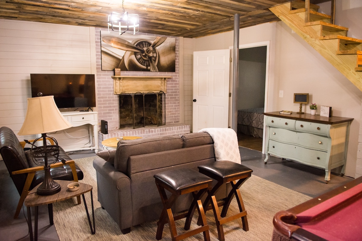 Welcome to your home-away-from-home! This space is a downstairs level of a brick home and has a loft like feel with unique industrial decor & an indoor bed swing! The pool table is a perfect way to end the day with friends. You won’t find another space like this! Pets are welcome and the fee is $50 per booking. This is a smoke-free home.