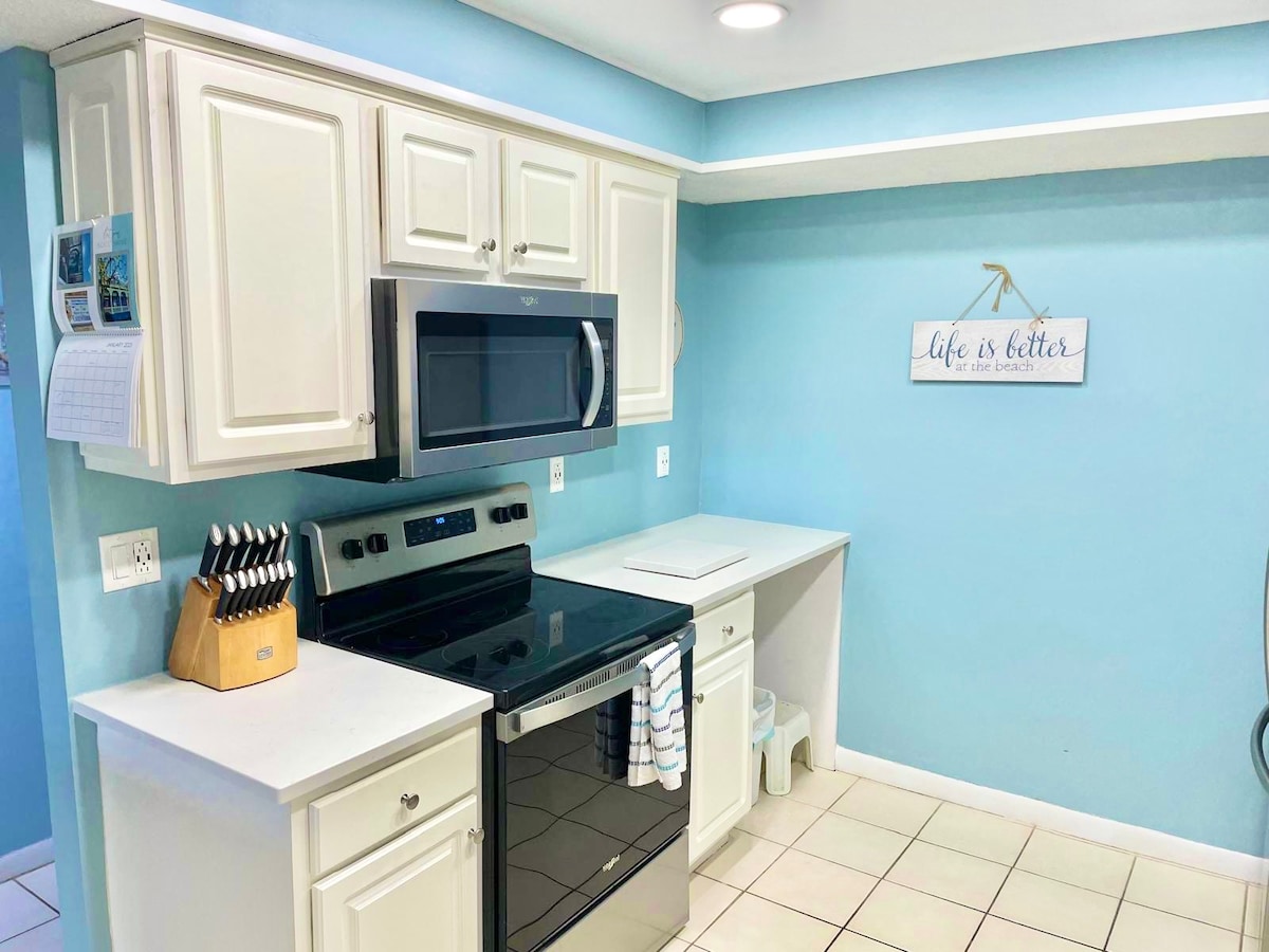 Newly Remodeled 1 bedroom condo with King Size Bed, Queen Size Sleeper Sofa, 55" TV's in Living Room and Bedroom. Stairs to 3rd Floor unit with private patio. Fully Equipped Kitchen, Dishwasher, Washer/Dryer, WiFi, Cable TV, Clubhouse, Fitness Room, Tennis Courts, 2 Swimming Pools (1 heated), Shuffleboard Courts, Picnic Area with Grills & Private Beach Walkway. Dog Friendly (1 DOG ONLY) with a $100 pet fee due on Check In. Must be able to climb stairs 3rd floor condo