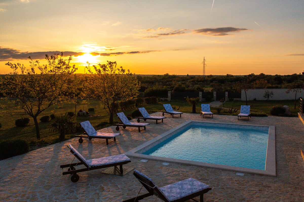 Autentična mediteranska kamena kuća sa velikim grijanim bazenom (30 m2 sa klupom za đakuzi) u selu u blizini Zadra. Ukupna površina zemljišta je 300 m2 sa privatnim parkingom, baštom,velikim grijanim bazenom, 6 drvenih kreveta za sunčanje i dva velika terasa sa salonom. Za zabavu se nalazi bilijar, tenis za sto,gol za fotball, picado. Kuća se nalazi u malom selu daleko od gradske buke. Ima prelijep otvoreni pogled na prirodu i maunte. Možete da uživate u potpunoj privatnosti. House is souranden by fields and you can see domestic animals