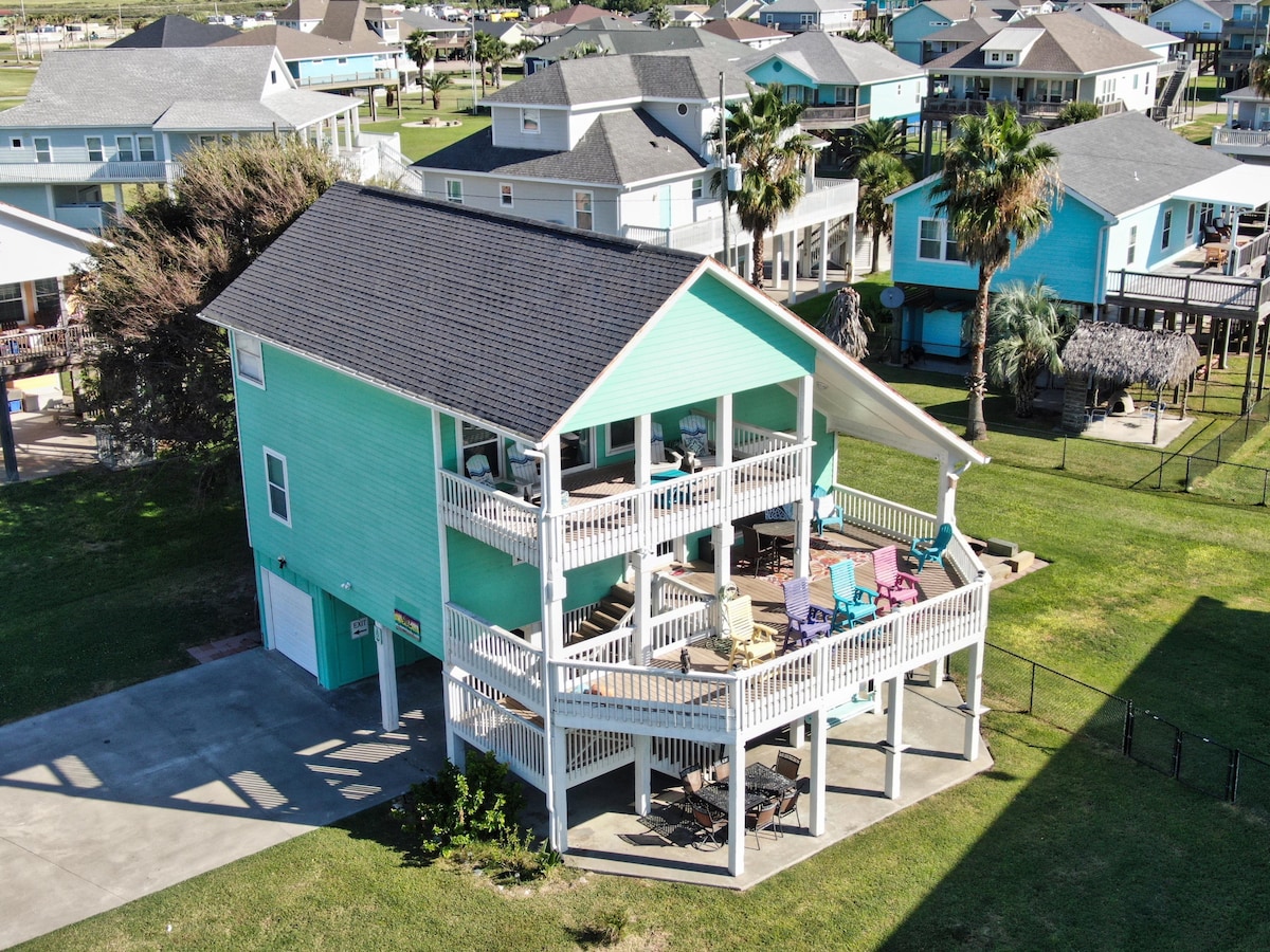 Unobstructed ocean views! See all the way down the beach to Galveston. Four bedrooms and 3 1/2 baths. Plenty of space and several decks for enjoying the sun. You have space to entertain, inside the beach home , but also underneath where you will find a large built in bar, propane/charcoal bar b q , swings, hammock loft and outdoor shower. Fenced in yard. Private walkover to the beach. Gourmet kitchen with butlers pantry. Tv's in every room. Master has soaking tub with beach view! Sleeps 14