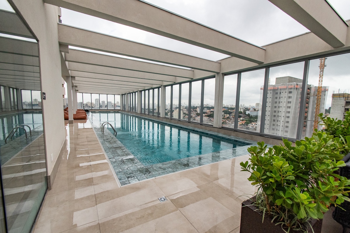 Kompletan studio u Vili Marijani, idealan za najviše 2 osobe, sa bračnim krevetom (širine 150–179 cm), klima-uređajem, zavesom za zamračivanje, pametnim televizorom od 43 inča, Wi-Fi mrežom i opremljenom kuhinjom. Posteljina za krevet i kupatilo su obezbijeđeni. Novi kondominijum sa bazenom, teretanom, zajedničkim radnim prostorom, igraonicom, vešernicom (plaća se posebno), 24-časovnim konsijeržom i tržnim centrom sa restoranima i pogodnostima. 500 metara od metroa Santos-Imigrante, u ulici Vergueiro, sa lakim pristupom aveniji. Paulista, muzeji, bolnice i usluge. Savršeno za odmor ili rad.