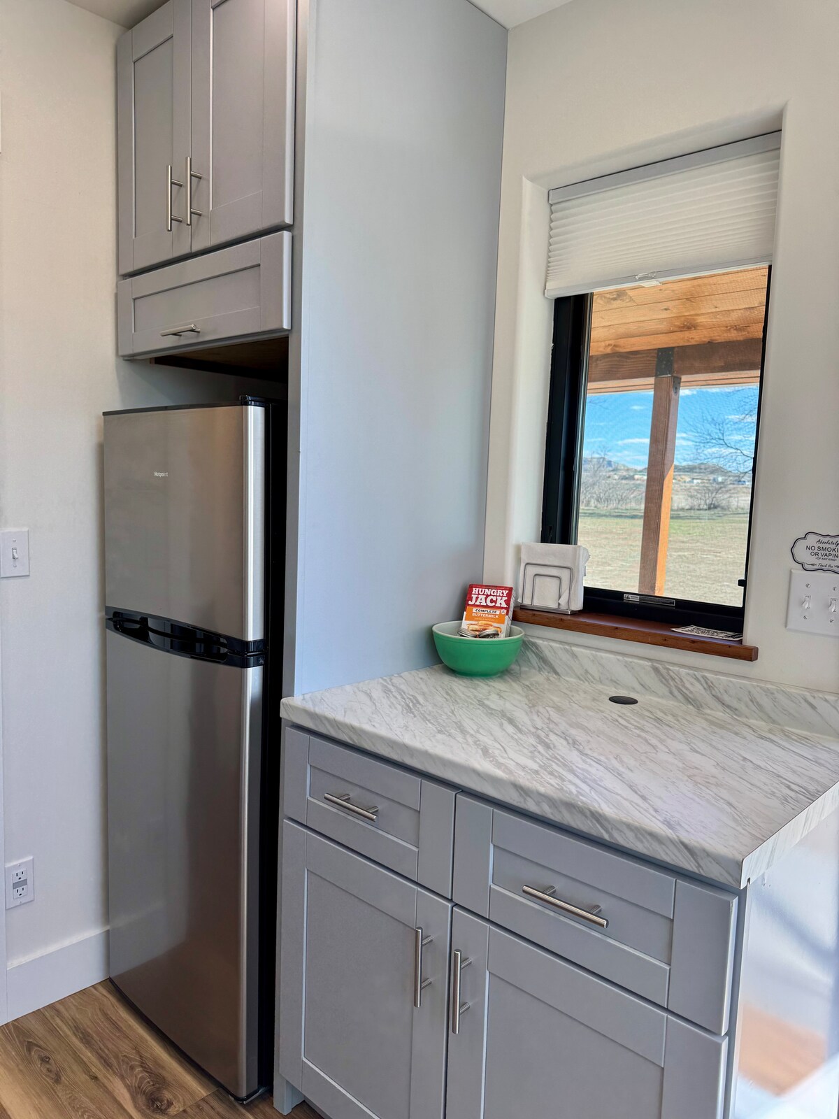 This new 1200 square foot single family home was designed for comfort and functionality. You will have a spacious fully stocked kitchen with a large island for food prep and dining. The 12 x 16 deck with ramp provides an easily accessed outdoor area. The guest bathroom contains a bathtub/shower and laundry closet perfect for longer stays and for families with children. The master bedroom has a large walk-in closet and master bathroom with double sinks and grab bars in the walk-in shower.
