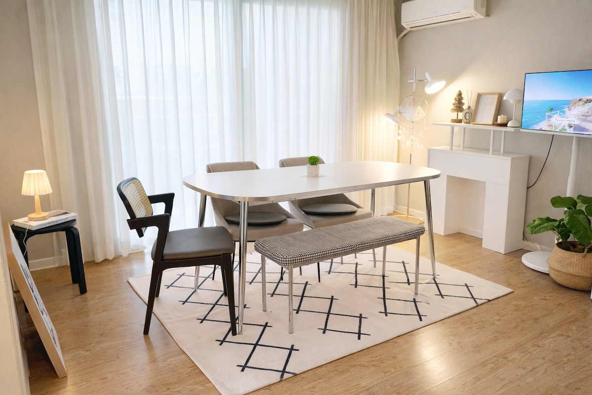 🍭“더보기” 클릭 후 숙소 설명을 꼭 읽고 예약 필수 - 건물내 주차 불가(밑에 인근 유료주차장 참고해주세용) - 짐보관 가능🎶 ⏱️체크인 4pm - 체크아웃 11am 입니다. 💎후기 이벤트 참여하면 무료로 13시레이트 체크아웃! 호스트가 직접 관리하는 숙소입니다😁 매일 방역 및 청결하게 유지하고 있습니다. ✔️숙소 옵션 -삼성 스마트 TV -삼성 시스템 에어컨 -초고속 wifi 지원 -삼성 스타일러 -드럼 세탁기 -커피 포트기 ✔️주방 옵션 -인덕션 2구 -머그잔/와인잔 -s접시/m접시 -냄비1개 -조리도구(집게,국자,가위,칼) -수저셋트 저희 숙소는 간단한 조리(라면)만 가능합니다‼️ 참고해주세요!!😉🙏 ❌삼겹살,스테이크, 국, 찌개류, 파스타❌ 화장실 옵션 -핸드위시 -폼클랜징,클랜징오일 -샴프/컨디셔너/바디워시 -바디로션 -화장솜/면봉 -헤어드라이기 고데기