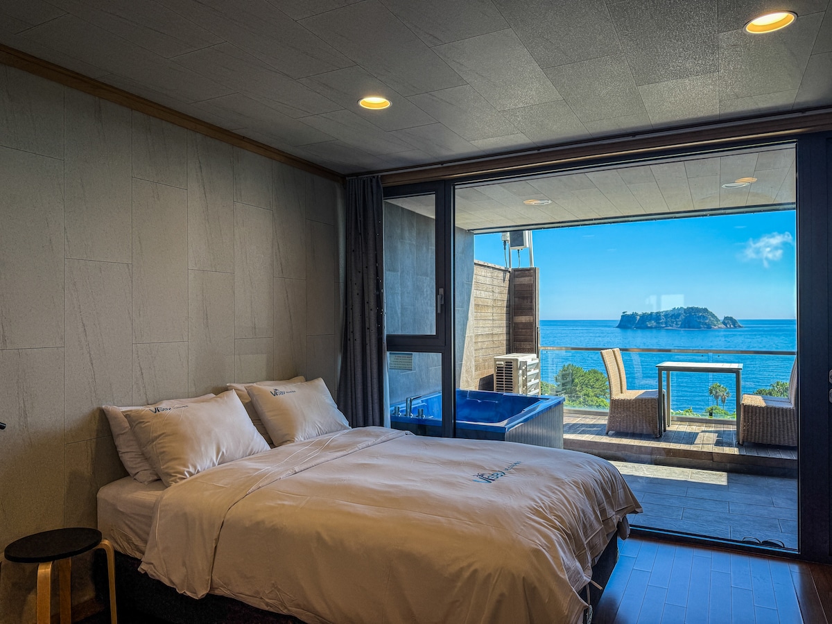Hello. Perched on a cliff in central Seogwipo, this suite offers ocean views where islands and sea meet on one horizon. The 66㎡ private space keeps you apart from other travelers. Studio-style, yet spacious, with separate bedroom, living, and kitchen zones for an easy flow. On the terrace, soak in the spa and enjoy a private barbecue above the water. Free breakfast served with wide sea views. May to October, swim in the infinity pool facing Beomseom. The rooftop garden captures Jeju sunsets.