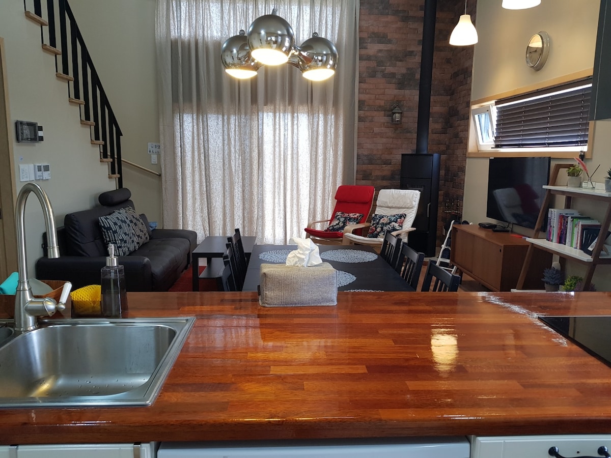 ovo je dvospratna samostojeća kuća. živimo u prizemlju sa pripremama da vam pomognemo. i možete da odsjednete na drugom spratu, a ulazna vrata su druga stvar. drugi sprat je dupleks tip i postoje dvije krovne terase, veliki salon tavan. jedna terasa je pogled na more, a druga je pogled na planinu Hallasan. dnevna soba je kao kafić u stakleniku sa ogromnim staklenim prozorom. prizemlje je kuhinjska bašta. Volim da sjajim razne vrste biljaka. Ako nešto skuvate, možete da berete ovo povrće.
