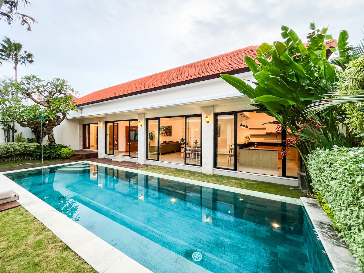 NOVO KLIMA-UREĐAJ U DNEVNOJ SOBI ❄️ Prelepa, prostrana i moderna vila sa dve spavaće sobe u srcu Canggua. Objekat ima zatvorenu dnevnu sobu sa klima-uređajem ❄️ Potpuno opremljena kuhinja, privatni bazen i bašte. Svaka spavaća soba ima kupatilo, klima-uređaj i kvalitetnu posteljinu. Samo nekoliko minuta hoda od najboljih restorana, barova, plaža, spa centara, teretana i dizajnerskih butika u Čangu, a samo 5 minuta vožnje do Pererenana.