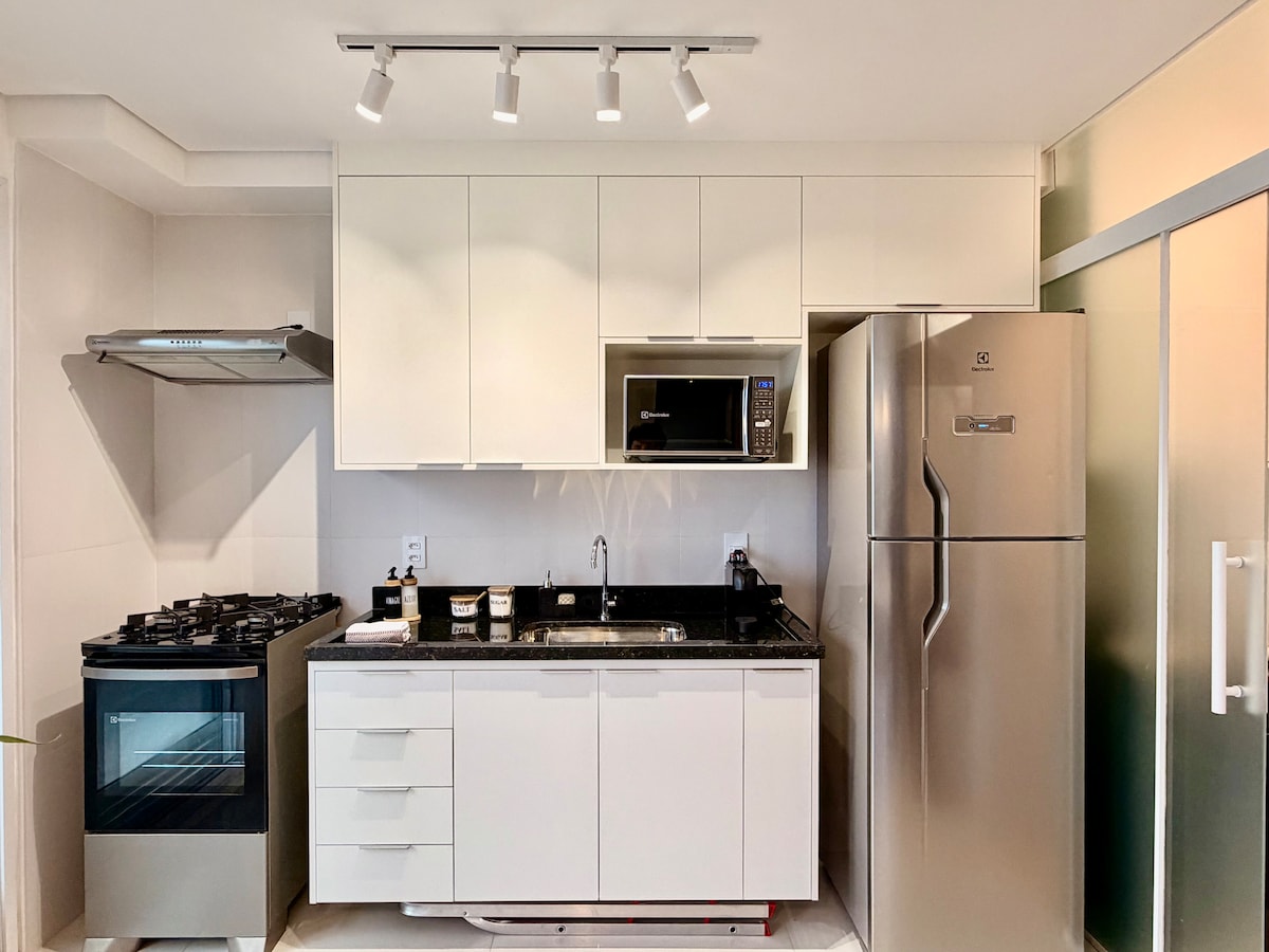 „Moderni studio s panoramskim pogledom”: soba s bračnim krevetom i posteljinom u rovovima, opuštajuće kupatilo s buddemeyer peškirima, radni prostor s Wi-Fi mrežom, udobna soba s pametnim TV-om, vešeraj i kompletna kuhinja, moderan i udoban dekor. Rezervišite sada i osjećajte se kao kod kuće. Kondominijum sa bazenom, parkingom i pijacom Front to usp U blizini Santa Kasa Pored šopinga i teretana Pored pekara i pijaca