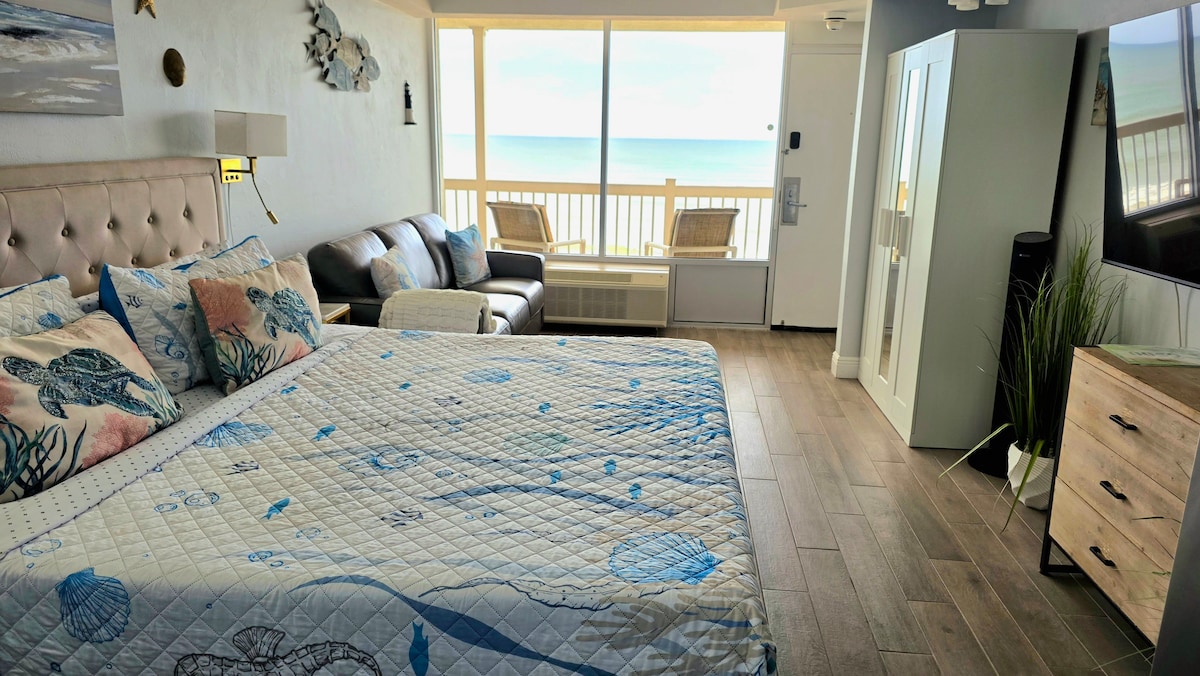 NIGHTLY PRICE REDUCED due to Building renovations restricting our balcony usage. ON THE BEACH! Your very own cozy spacious studio with a private balcony* overlooking the Sand, Surf, and Sunrises. Daytona Shores is the serene beach of Daytona and is just a few short minutes away from a variety of activities and restaurants. Our 3rd-floor unit is completely remodeled with free dedicated 45+Mbps WiFi, streaming channels, a full kitchenette, and free parking. *Unavailable beginning November