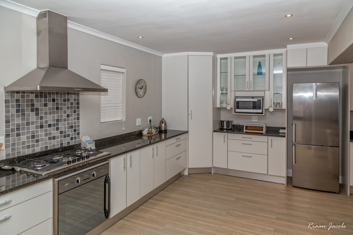 Ova moderna, prostrana seoska kuća nudi sve što vam je potrebno za savršen odmor ili kratak odmor. Zapanjujuća bašta sa bazenom. Unutrašnja/spoljašnja braai soba sa trpezarijom i namještajem za opuštanje. Potpuno opremljena kuhinja sa modernim ugradnim šporetom, Nespresso, aparatom za kafu, mašinom za pranje sudova, mašinom za pranje veša i mašinom za sušenje veša. Spavaća soba s bračnim krevetom i dovoljno izgrađenih ormarića i kupatilom u apartmanu. Udoban salon. Veliki Smart TV, koristite sopstvene aplikacije za striming. Brzi Wi-Fi. Manje od 1 km od centra grada i litice.