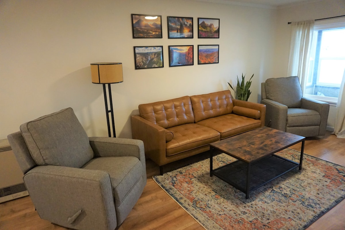 Svuda možete da pešačite! 2 bloka do centra, 3 bloka do parka, 4 bloka do bolnice, 5 blokova do terena za golf, potok je odmah preko puta! Uživajte u besplatnom Wi-Fi mrežom, besplatnom parkingu u sklopu smeštaja i elegantnoj Art Deco atmosferi u ovom smeštaju sa 2 spavaće sobe za 5 osoba. Zašto će vam se svidjeti: Veliki bračni krevet i zavjese za zamračivanje Potpuno opremljena kuhinja + kafa/čaj Bračni krevet (širine 150-179 cm) Pametni TV i igre za kišne dane Mašina za pranje/sušenje veša u jedinici Jeste li spremni za jednostavan boravak na pješačkoj udaljenosti od svega? Rezervišite datume odmah prije nego što odu!