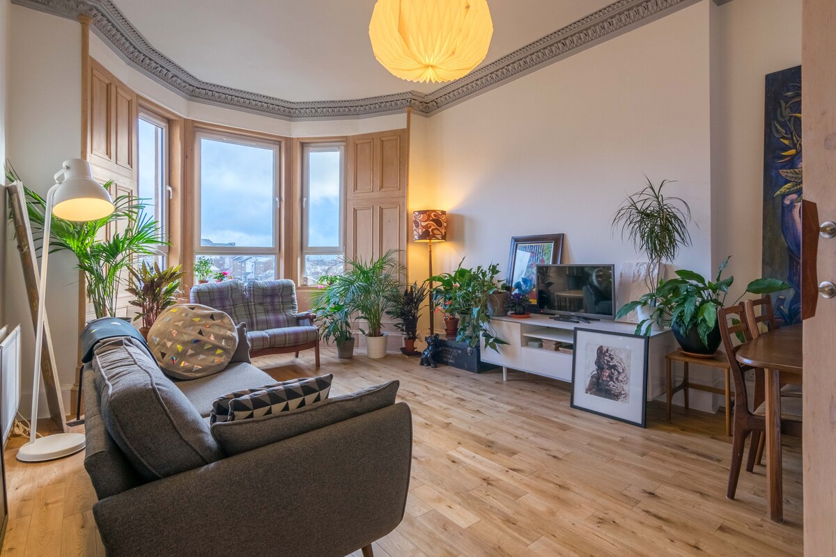 Fantastična, mirna lokacija u srcu Kelvinbridža, nekoliko minuta hoda do parka, Univerziteta, umjetničke galerije i prodavnica, kafića i restorana u Vest Endu. Prizemlje kuće u nizu iz 1870-ih, Veliki dnevni boravak - otvorena vatra, trpezarijski sto. opremljena čajna kuhinja - frižider, kutija za led, kafić. Velika, sunčana spavaća soba, carski krevet, pamučna posteljina, prirodni dušek, teške zavjese . Kupatilo ispunjeno biljkama, samostojeća kada, tuš u ravnini poda. Brzi WiFi. TV od 50inča. Alexa muzika. Kontrole grijanja