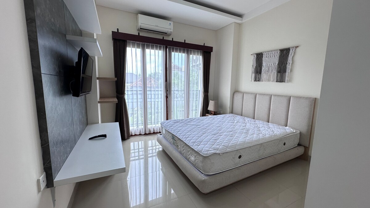 Novi potkrovlje „Tri Mezanina Bali“ elegantan i moderan. Dnevni boravak u prizemlju sa otvorenim konceptom, opremljen udobnim kaučem na razvlačenje, potpuno opremljenom kuhinjom, pametnim TV-om od 80 cm + subvuferom, Wi-Fi mrežom do 400 mbps. Prostor za spavanje u mezaninskom stilu sa privatnim balkonom i privatnim parking mjestom. Savršena lokacija za parove, solo putnike i digitalne nomade. Strateška lokacija, blizu plaže Sanur i centra grada. •7 minuta do plaže Sanur •7 minuta do Međunarodne bolnice na Baliju •40 minuta do aerodroma Ngurah Rai