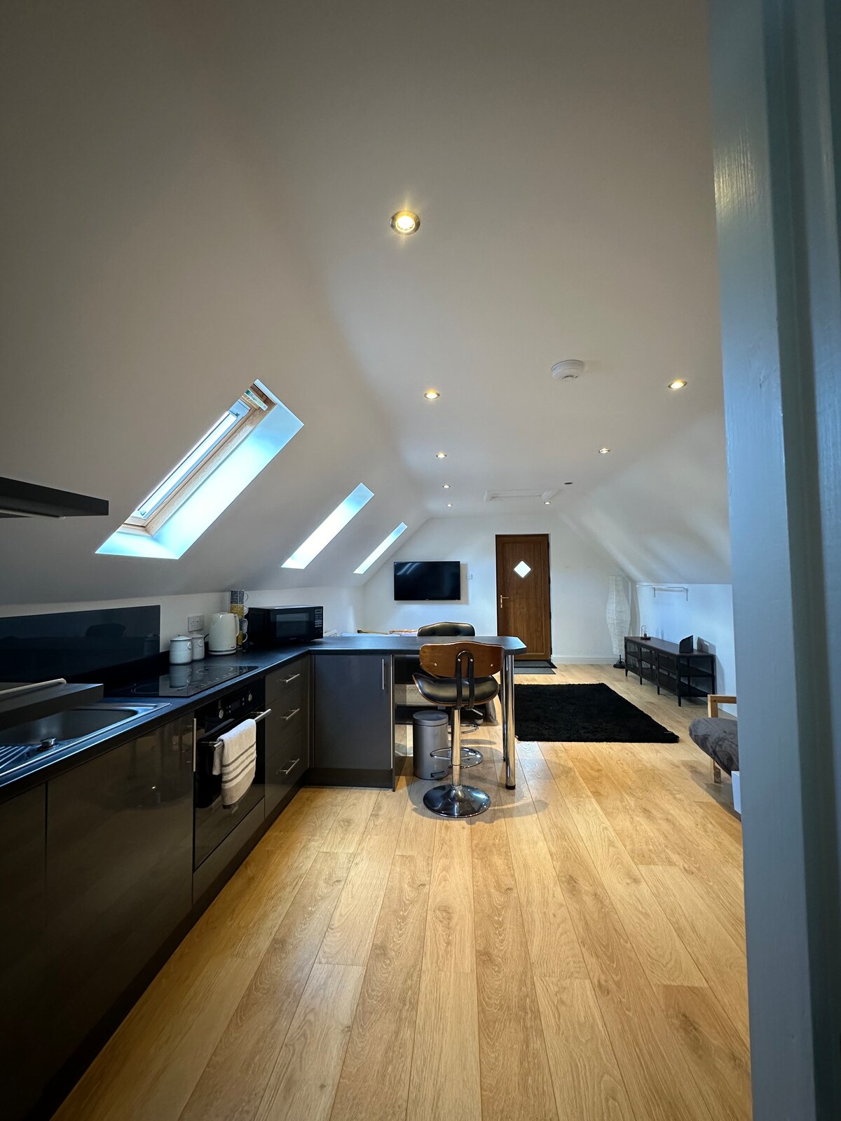 This lovely open plan loft apartment is in Woodthorpe, a charming hamlet on the outskirts of Loughborough. A five minute drive to Loughborough or the University. The loft has views over Beacon Hill and can walk directly out into the countryside. It is situated on a country lane which not a through road so very quiet. The property has a small kitchenette with a microwave, two ring induction hob, frying pan and saucepan. A fridge, sink, kettle and plates, bowls and cutlery.