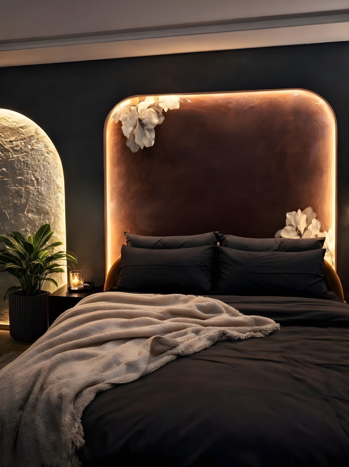 Nur e Gul – romantično utočište obasjano mesečinom Mekan, topao i tiho opojan, Mehtaab je prostor dizajniran za trenutke koji traju. Okupan zlatnim ambijentalnim svetlom, apartman sija kao mesečina koja se odmara na baršunu. Zakrivljeno osvetljeno uzglavlje deluje više kao isklesano nego kao napravljeno, obavijajući krevet toplinom i intimnošću. Prigušeni zemljani tonovi, plišane teksture i nežne senke stvaraju umirujuću atmosferu u kojoj se vreme usporava. Suptilni cvetni detalji cvetaju na blago osvetljenim zidovima