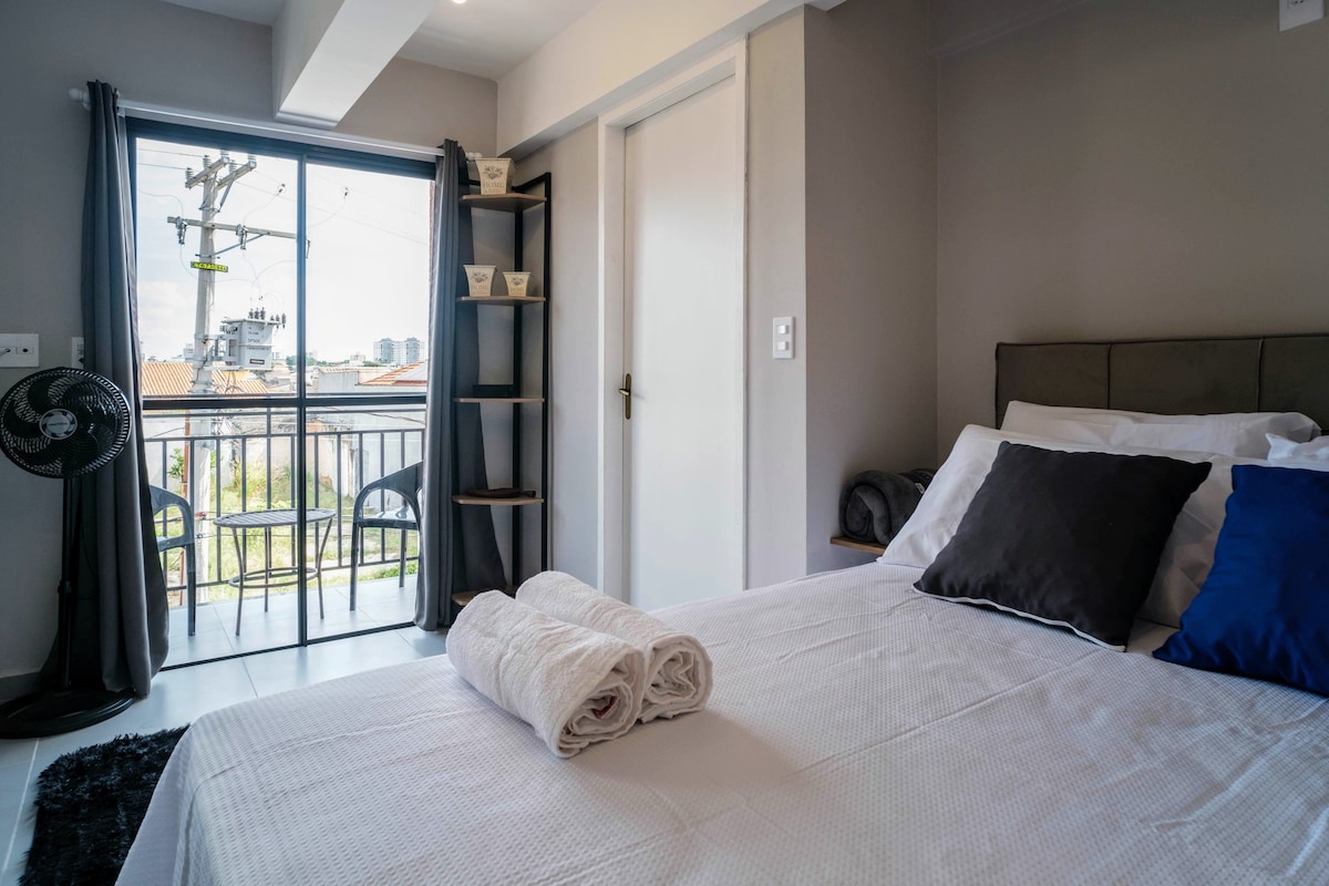 MODERAN STUDIO APARTMAN, kompletan i sa balkonom! Porodični prostor po nevjerovatnoj cijeni! * ** BRAČNI KREVET (ŠIRINE 150-179 CM) + kauč na razvlačenje za JEDNU osobu. Potpuno opremljena kuhinja, kućna kancelarija sa Wi-Fi mrežom, Smart TV sa desetinama kanala i posteljina za krevet i kupatilo! U zgradi imamo prodavnicu i čekaonicu! * 5 minuta metroa Jabaquara * 10 min SP Expo * 11 min Shopping Plaza Sul * 13 minuta do aerodroma Kongonhas * 5 minuta bolnica Sao Luiz * 10 min Paraolimpijski centar * 25 min Vibra SP * 7 minuta CEIC Itaúa Srednja vremena