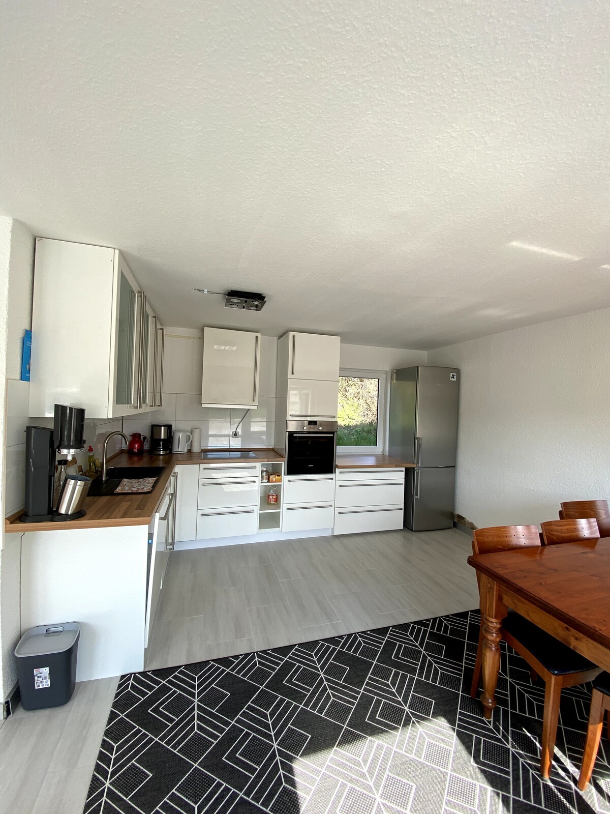 Die Wohnung ist 100 m² groß, eine große Küche, ein Ess-Wohnzimmer, drei Schlafzimmer Badezimmer mit Wanne. Ein Babybett steht ebenfalls zur Verfügung. Bereits nach nur 2 Minuten zu Fuß erreicht man wunderschöne Wanderwege. Auch ein Spielplatz für Kinder ist fußläufig erreichbar. Hunde sind herzlich willkommen. Allerdings dürfen Hunde nicht auf die Möbel, und der Garten darf nicht als Hundetoilette genutzt werden. Für Gäste mit Hundeallergie ist die Wohnung daher leider nicht geeignet.