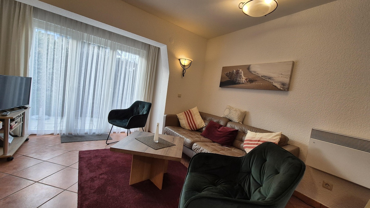 Kleines Apartment für bis zu drei Personen mit - Offener Wohnküche - Erkerzimmer (mit Schlafsofa) - vollausgestattete Küche - direkter Gartenzugang - umzäunter Garten - Sitzmöglichkeiten im Garten - Duschbad (geräumige Dusche) - großes Doppelbett - Stellplätze nebenan können vermittelt werden - Fahrradabstellmöglichkeit