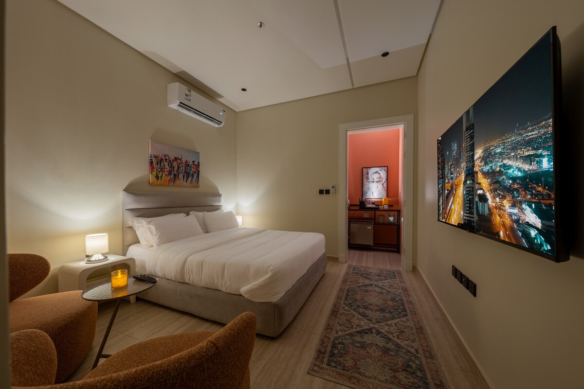 Luxury studio with Self-Entry consisting of a bedroom, kitchen, and a fully equipped bathroom (shampoo, slippers, one-time use towels, tissues). • Besides Boulevard in Hittin, North Riyadh… The location is ideal, close to major events such as Riyadh Season, Diriyah Season, and all essential services like restaurants and shopping. Specifically: -Boulevard City 6 minute walking -Boulevard World 7 minutes walking -Arena Stadium 9 minutes walking