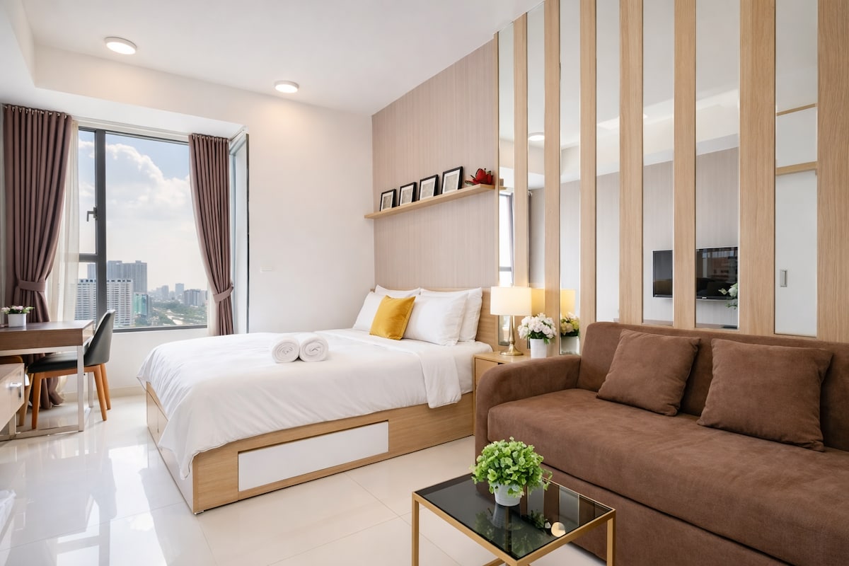Zgrada ima veliki bazen s otvorenim pogledom i zeleni park koji stvara izuzetno impresivan prostor. Najbolje što možete da uradite je da uhvatite zalazak sunca u prvom planu gdje možete da vidite rijeku Sajgon kako teče unaokolo, a sunce se postepeno spušta kako bi se stvorile prelijepe boje. Ovaj studio je doživljaj za pronalazak iznenađenja u domu, veoma pogodan za rođendansku zabavu, privatni sastanak, proslave iznenađenja, boravak za godišnjicu, pisanje mahune, boravak na putovanju, odmor i još mnogo toga!