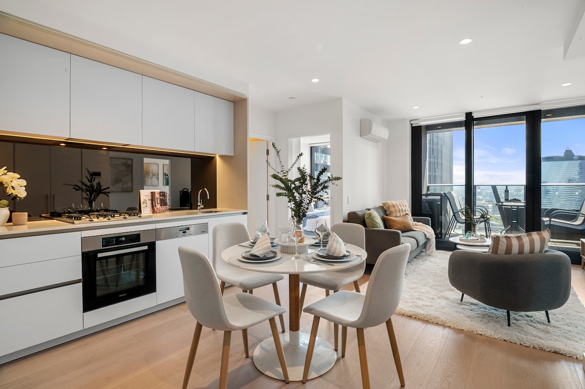 Smešten na 35. spratu zgrade „Melbourne Quarter“ u Docklandsu, ovaj prelepi dvosobni stan pruža vam pogled na ceo grad. Prozori od poda do plafona uokviruju panoramski pogled na grad, dok elegantan enterijer i vrhunske završne obrade stvaraju ugođaj opuštenog luksuznog utočišta. Opustite se uz pristup bazenu u stilu odmarališta, potpuno opremljenoj teretani i sauni. Napolju, stanica Southern Cross, akvarijum SEA LIFE, kazino Crown i najbolji restorani u Melburnu udaljeni su svega nekoliko minuta. Savršeno za parove, porodice i poslovne putnike.