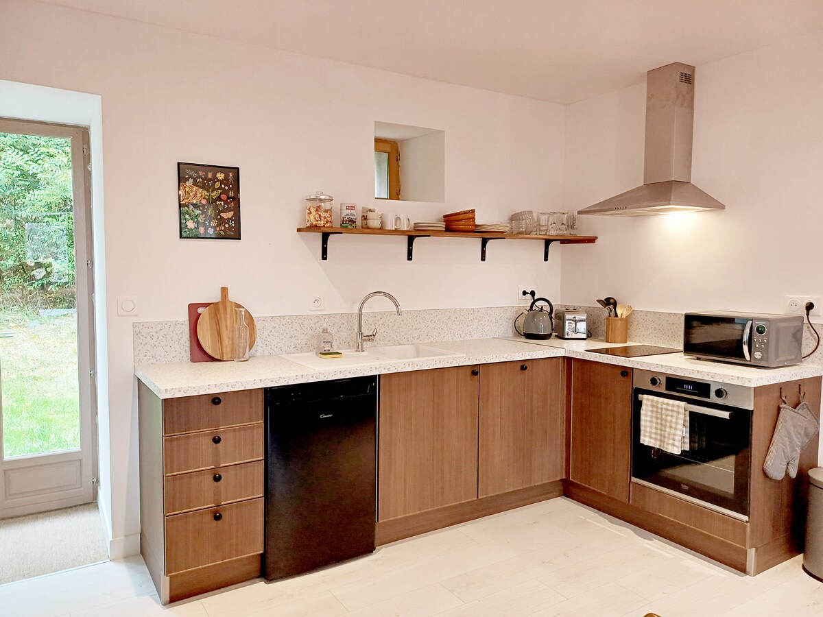 Smeštena u dolini reke, u Perheu, u blizini planinarskih staza i dvoraca, naša seoska kućica idealna je za opuštajući vikend: nakon što posetite region biciklom, peške ili automobilom, možete da se opustite u spa centru, uživate u „svetlosnoj terapiji“ uz zvuk meke muzike, razmišljate o prirodi. Zatim udobno sedite na terasi u sumrak ili na kauču ispred peći na Norveškoj, probajte proizvode Perche sa porodicom ili prijateljima.