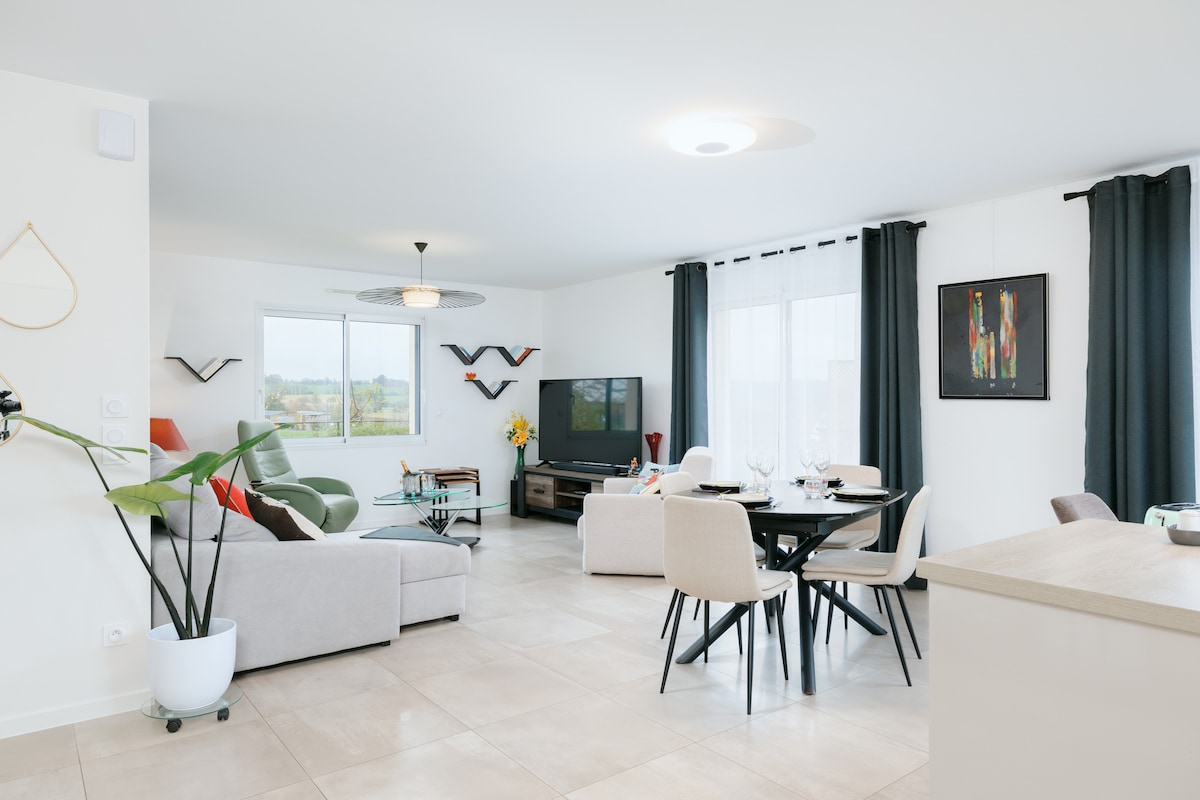 Pet minuta od zaliva Mon Sen Mišel, ovaj mirni i nezavisni smještaj nalazi se između kopna i mora. Bićete na 7 minuta od bijelih pješčanih plaža i plivanja, 10 minuta od odlazaka za prelazak zaliva, 35 minuta od Mon Sen Mišela i 15 minuta od Grenvila gdje možete da se ukrcate na Kanalska ostrva!🏝️ Dnevni boravak gleda na malu sunčanu terasu na kojoj možete uživati u obrocima ako želite. Ležaljke za sunčanje vas čekaju na suncu 🌞
