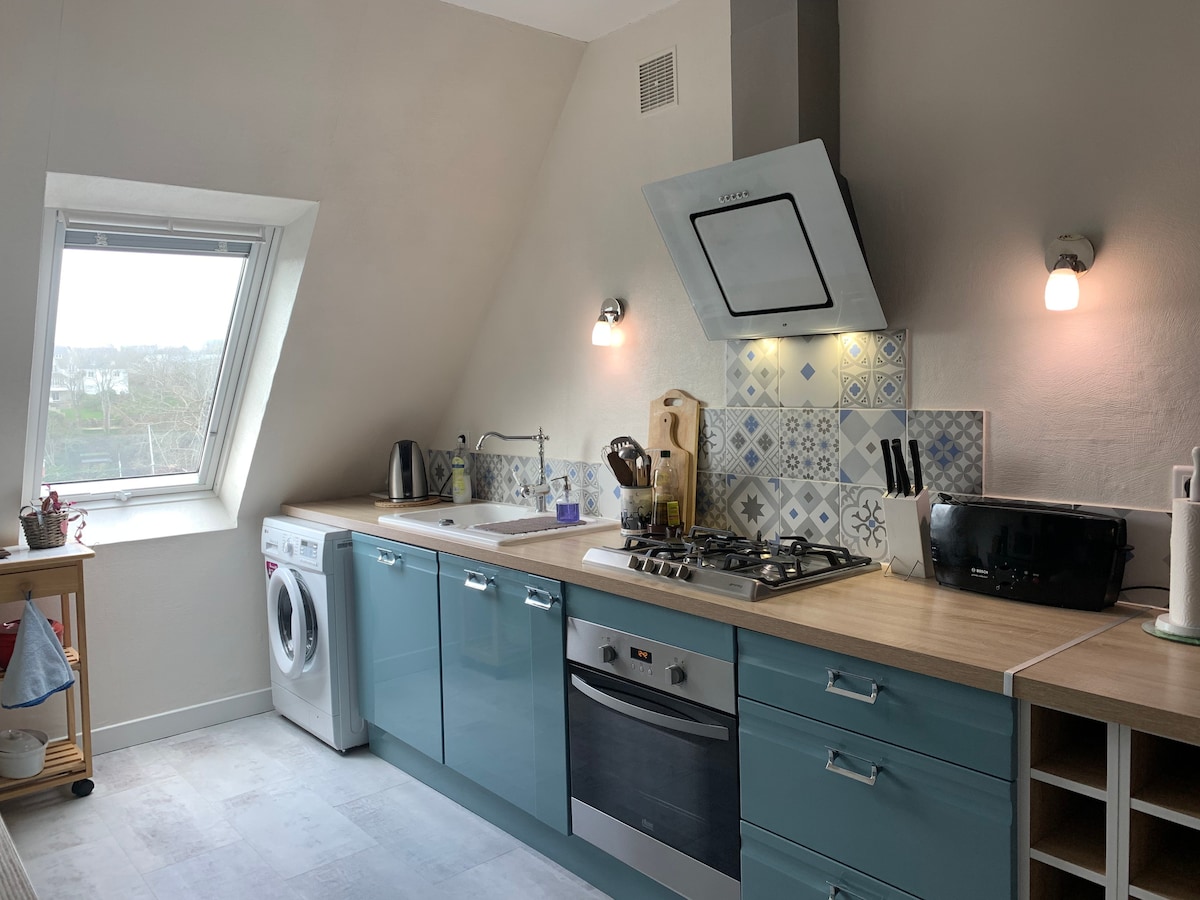 En plein coeur de Douarnenez , situé dans une rue calme, ce duplex de charme (rénové en 2020) vous propose un coin cuisine équipée , un accès wifi ou RJ 45 selon votre sensibilité. Au 3eme étage d'une maison d'artiste , vous dormirez sous les toits au plus prêt des étoiles. TOUT A PIED:, plages, marché quotidien, commerces ( supérette et crêperie en face), restaurants, musée du bateau, les plomarc'h, parkings, si vous arrivez en bus il vous suffit de 5 min pour vous rendre à la location.