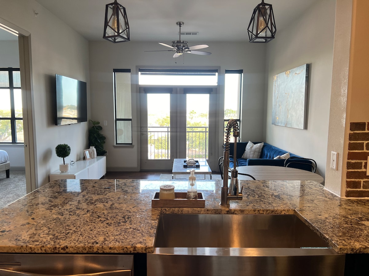Luxury 1BR apartment in a high-end community with fantastic amenities: pool, gym, fireplace courtyards, and parking garage. Includes WiFi, two TVs, coffee, full washer/dryer, and modern bath with tub. King bed for comfort. Walking distance to Whole Foods and shops. 8 minutes to Rice Village, 12 to the Medical Center, 15 to the Galleria, River Oaks, and Montrose. Perfect for a convenient, upscale stay!