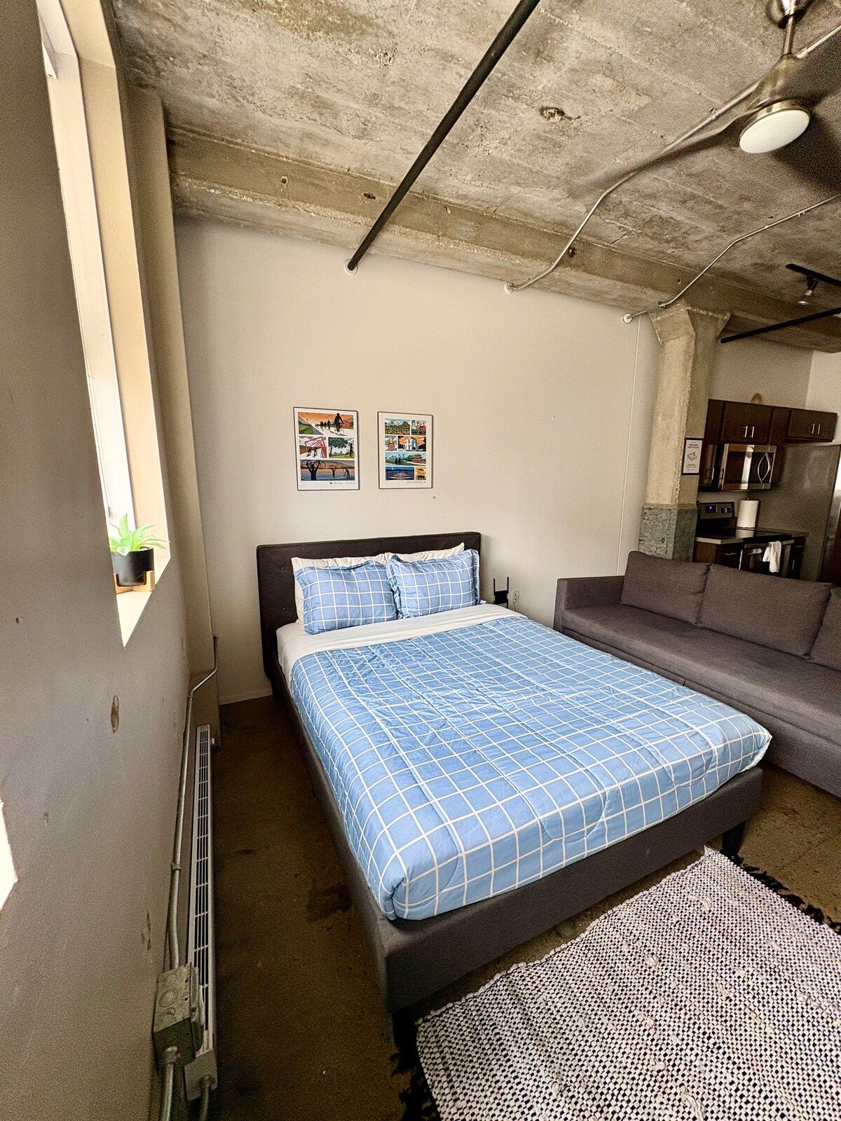 Welcome to our beautiful open concept industrial loft. Upon entering our cozy abode, you'll find a clean, bright, well decorated home with many great amenities where you can kick back, relax and enjoy your stay. If high ceilings and beautiful polished concrete floors are your thing, you will be in heaven. Steel railings give it a true industrial feel. Everything needed for your stay is well thought out and ready to be used. We hope you love our loft as much as we do! ***Pet Fee is $125***