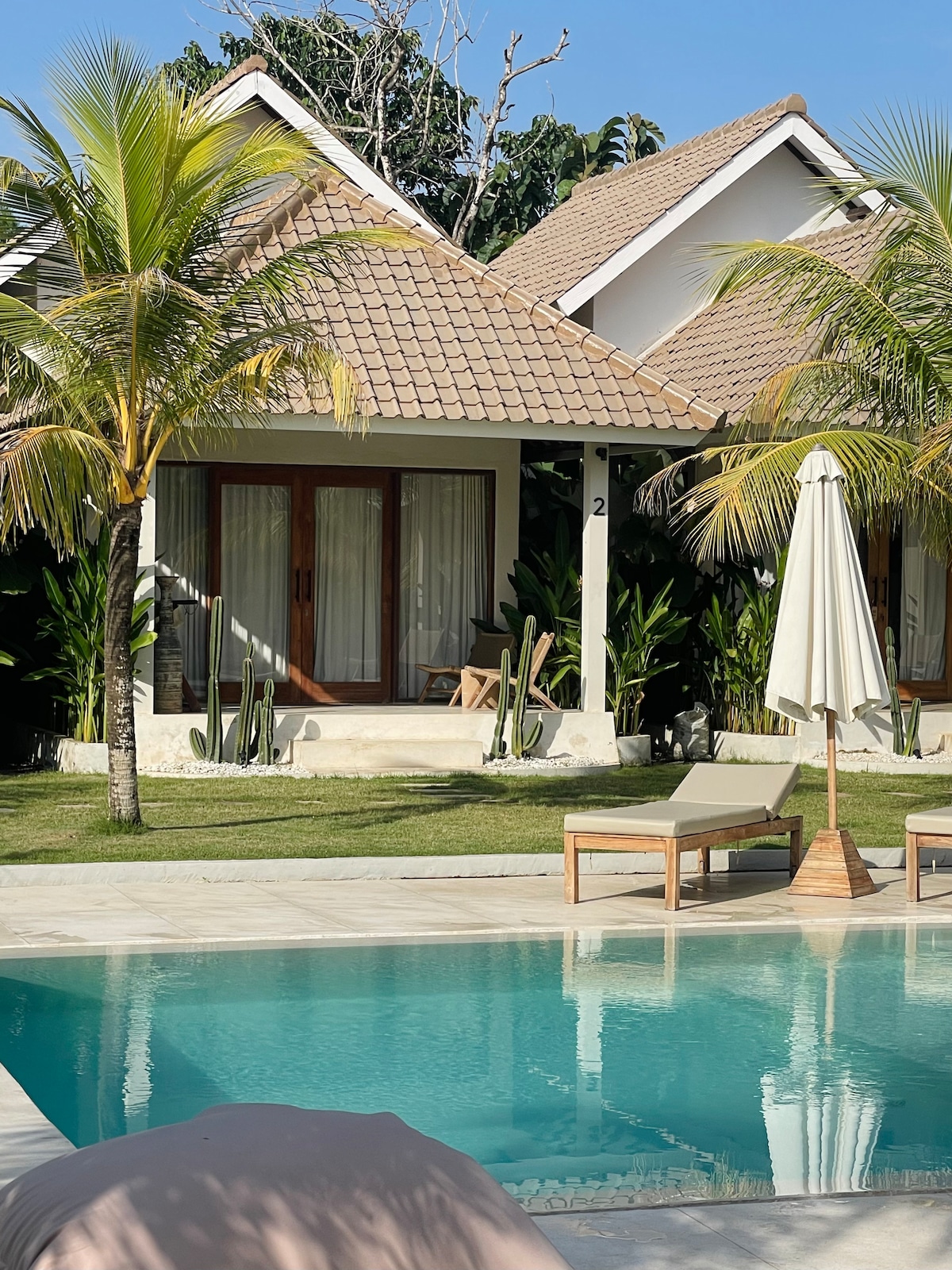 Standardna soba 4 - Ova udobna, ali profinjena soba vas poziva da se opustite u svom privatnom bazenu i baštenskoj oazi. Elegantan dizajn spaja tropski minimalizam i sirovu ljepotu, koristeći prirodne materijale i meku, zemljanu paletu kako bi se stvorila skladna energija. Krov alang-alang je predivno osvijetljen, a unutrašnjost održava svježom i umirujućom. Bilo da se opuštate na drvenoj terasi ili plutate u bazenu, soba 4 nudi jednostavnu vezu s prirodom.