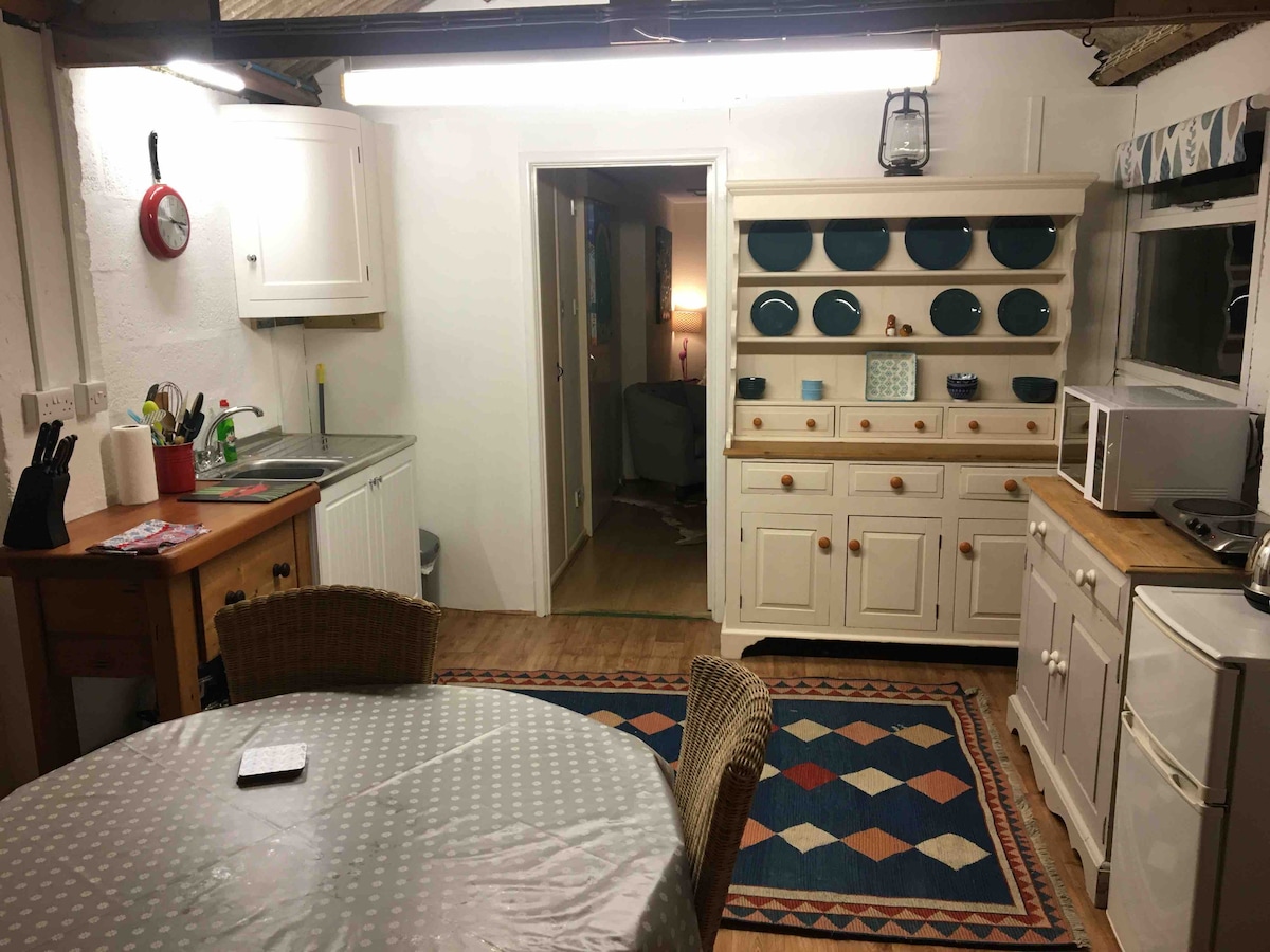 Smještena na našoj radnoj farmi, ova obnovljena željeznička kočija je savršeno mjesto za romantičan boravak. Pogled je izvan ovog svijeta i vidljiv je sa velikih staklenih vrata, tako da možete da ostanete ušuškani u krevetu ili na kauču ispred vatre, sa odličnim Wi-Fi mrežom, besplatnim pristupom našem prelijepom grijanom bazenu i sauni (nalazi se u kućici pored bazena), prelijepim šetnjama od kočije ili kratkom vožnjom do staze uz obalu, ručkovima u pabu, zalascima sunca, vilinskim svjetlima i romantičnim spoljnim kupatilom