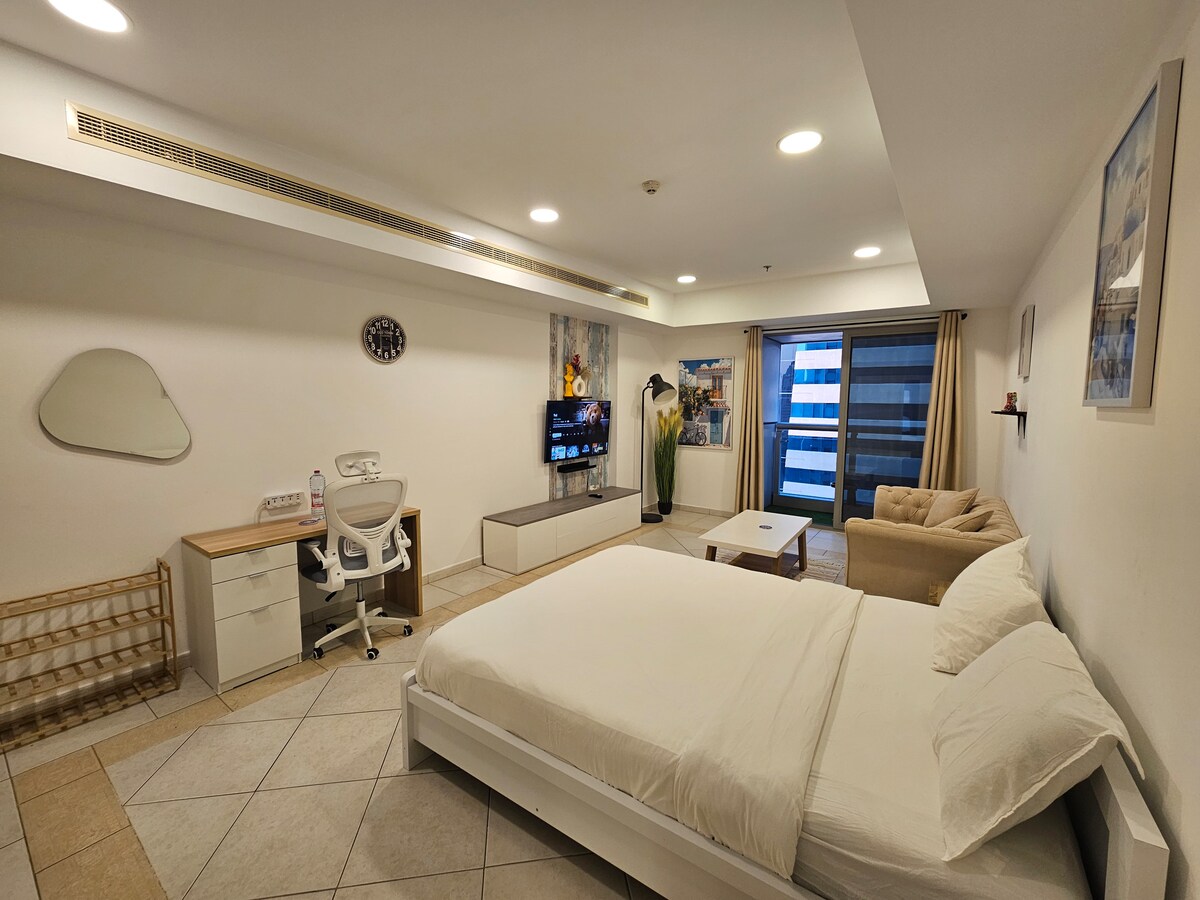 Doživite vrhunsku udobnost u našem elegantnom jednosobnom stanu sa zadivljujućim gradskim svjetlima i pogledom na marinu sa balkona. Savršena lokacija u blizini plaže JBR i tržnog centra Marina, udaljena je 10 minuta hoda od stanice metroa, što istraživanje čini jednostavnim. Uživajte u vrhunskim sadržajima, brzom Wi-Fi-ju, potpuno opremljenoj kuhinji i udobnom dnevnom boravku sa sofom na razvlačenje. Opustite se na balkonu sa pogledom koji oduzima dah. Rezervišite smeštaj za nezaboravno iskustvo u Dubaiju!