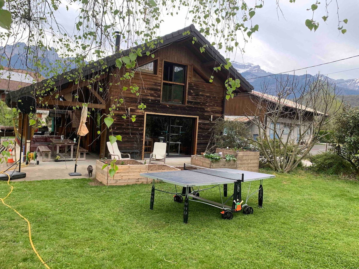 Dans un environnement calme et paisible, cette maison au pied de la montagne est à deux pas du lac, des commodités et de la piste cyclable Maison de 80m2, vous profiterez de son jardin, deux terrasses, plancha, table de ping-pong, internet/TV A l'étage, 3 chambres avec lit double, une salle de bain et un Wc séparé. Au rez de chaussée, une pièce à vivre d'environ 35m2, une salle de douche avec Wc, le canapé est convertible en lit de 140X190 Le lac est à 10min à pieds et la piste cyclable à 100m.