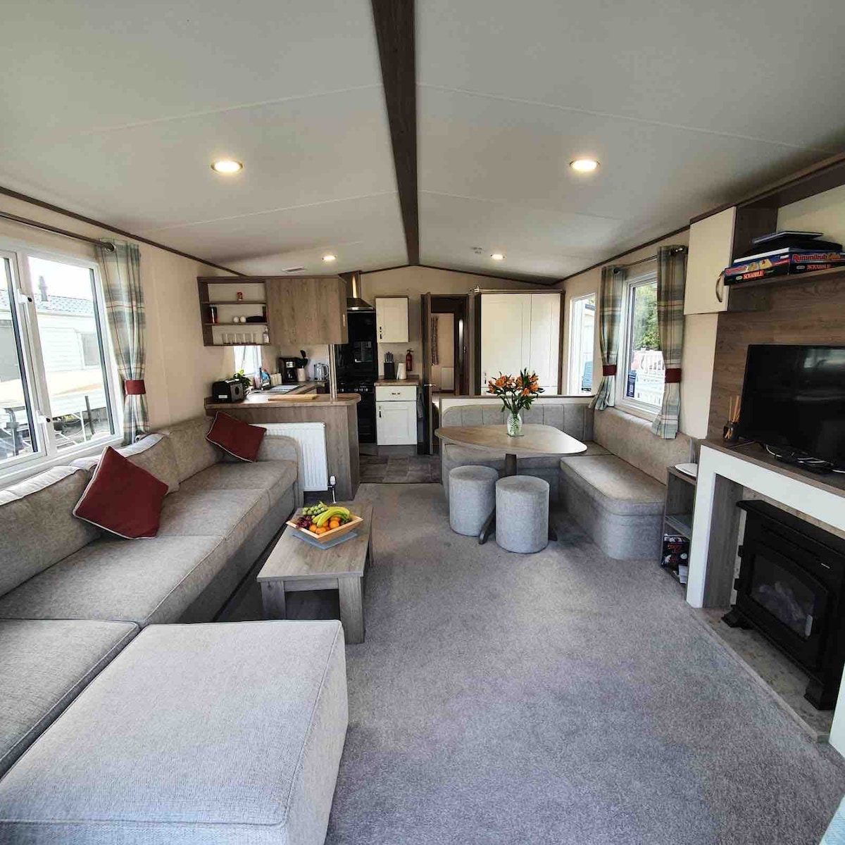 This top of the range gold caravan, which sleeps 6 is located at Marlie holiday park between the historic villages of New Romney and Dymchurch, Marlie Holiday Park is just a short drive from the beach and boasts its own indoor swimming pool, sports field, playground and a family bar. Perfect for a relaxing family holiday exploring the beautiful coast and countryside of Kent and East Sussex. The caravan comes with all the essentials including fast speed WiFi.