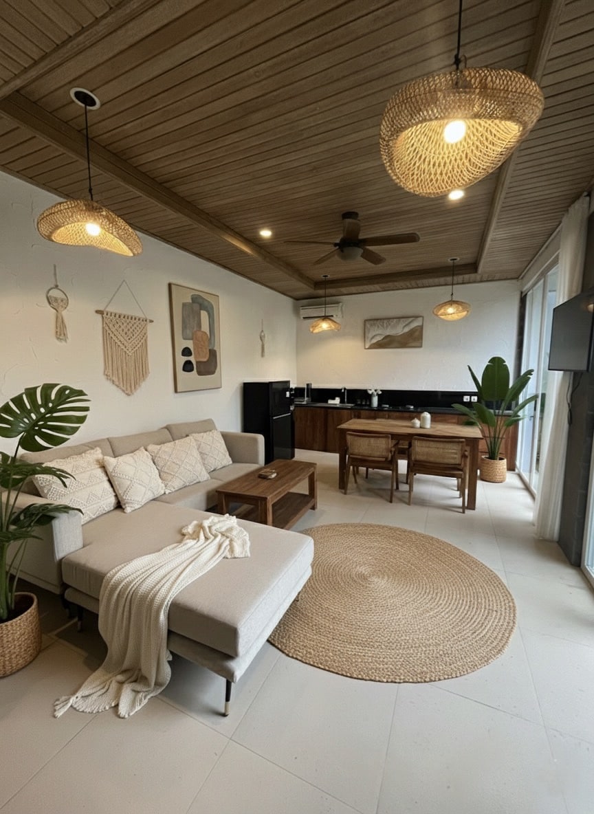 Ova zapanjujuća 3BR/3BA privatna vila spaja tropski šarm sa modernom udobnošću, na samo 5 minuta od plaže! Savršeno za porodice ili grupe, uživajte u suncem obasjanim otvorenim stambenim prostorima, potpuno opremljenoj kuhinji i luksuznim spavaćim sobama dizajniranim za potpuno opuštanje. Smješteni u jednoj od najživopisnijih četvrti Balija, samo vas nekoliko trenutaka dijeli od Finns Beach Cluba, Atlasa, vrhunskih kafića, studija za jogu, butika i noćnog života.