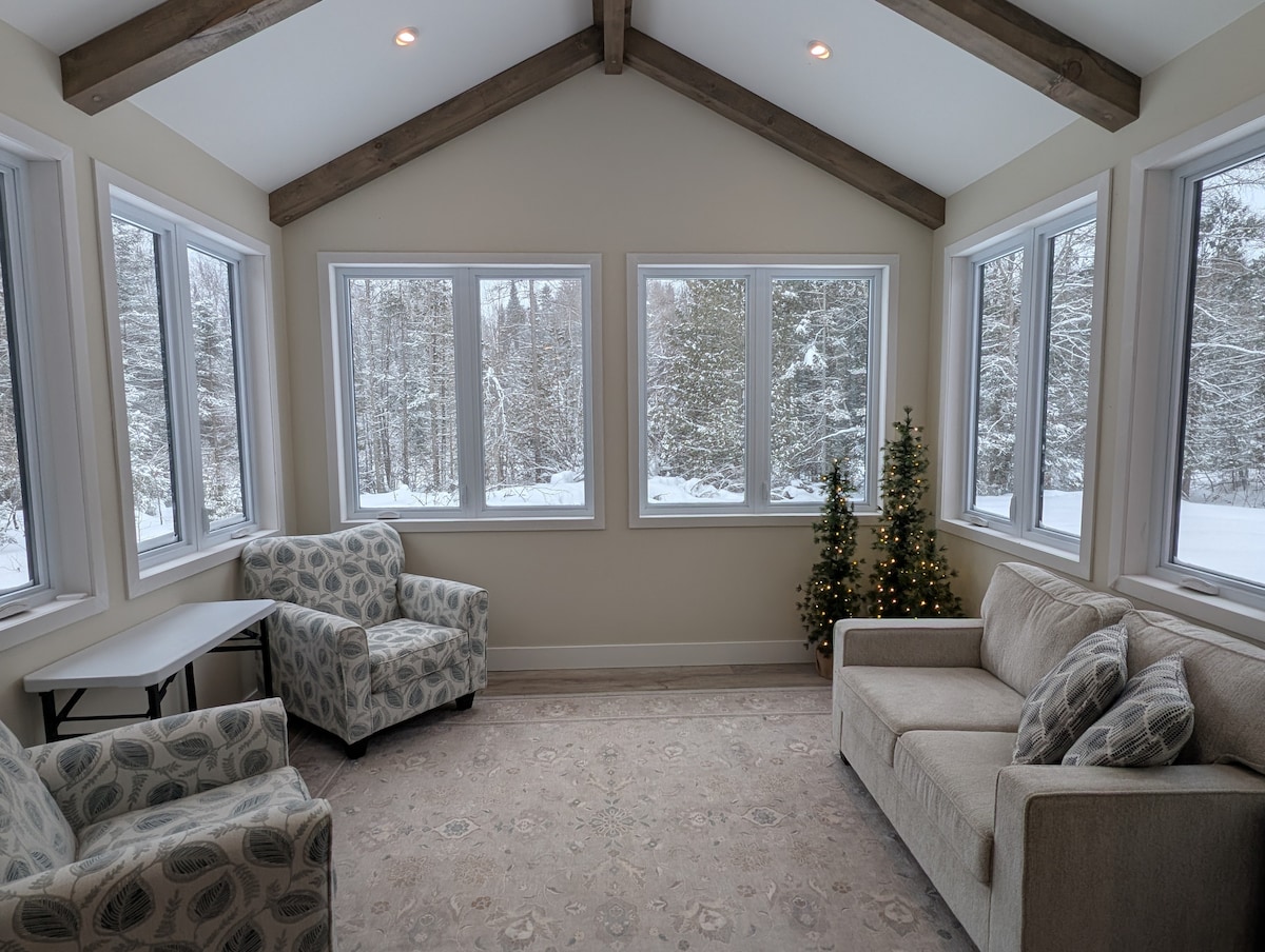 U seoskoj kućici se nalazi novi višenamjenski trpezarijski sto koji je takođe sto za bilijar i ima stoni tenis dostupan našim gostima. Hidromasažna kada i potpuno nova sauna na drva su lijepi i topli za hladnije vrijeme ovdje. Ova zgrada je prilagođena za invalidska kolica. Udaljeni smo 10 minuta od Hwy 11 i 10 minuta do grada Powassan. Uživajte u više od 70 hektara u prirodi samo za sebe. Prekrasan miran odmor za svakoga. Nalazi se na južnoj rijeci.