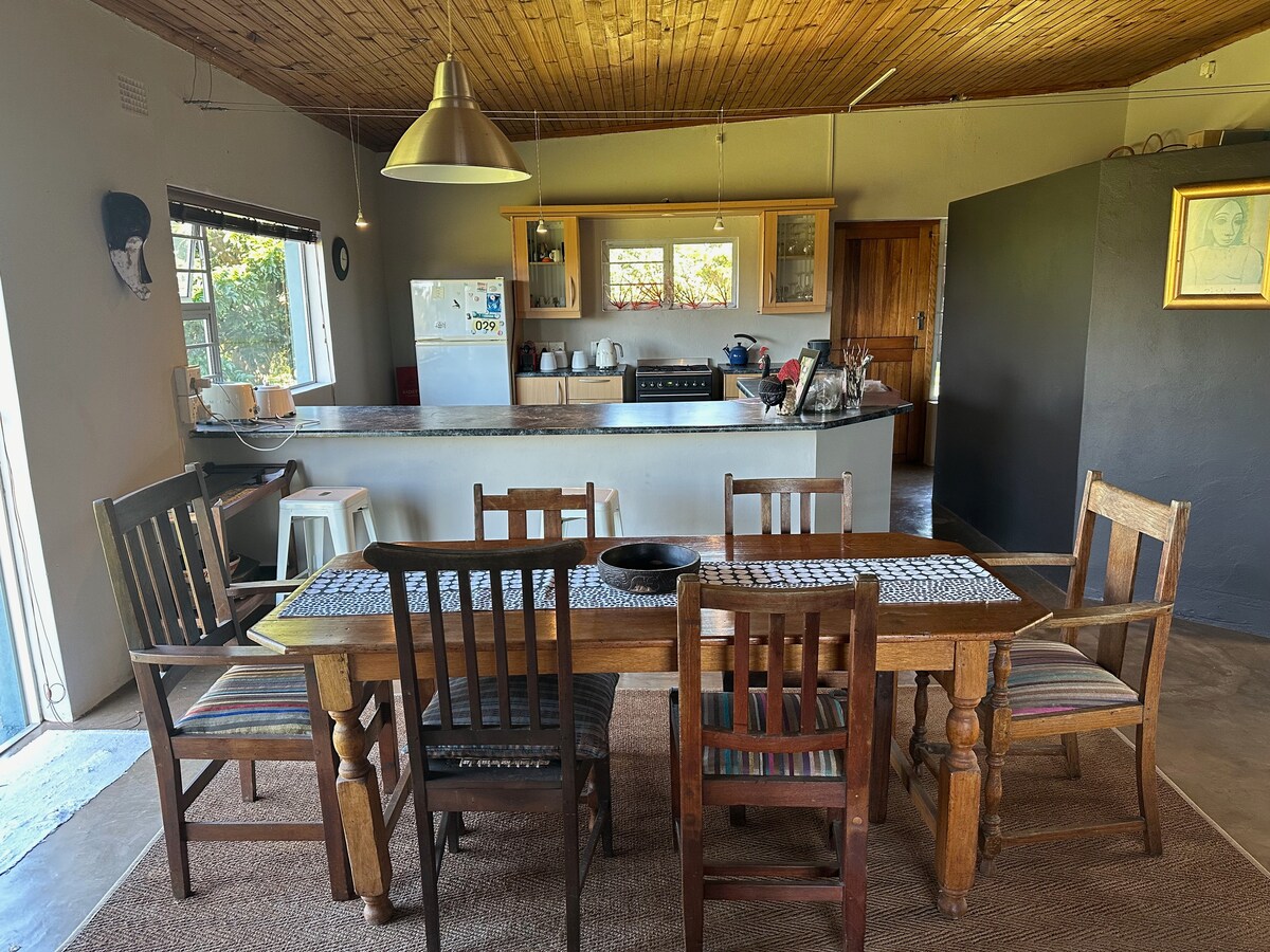 Beautiful sea views and a wonderful space to relax with family and friends just a 5 minute walk to the beach. The house sleeps 6 people comfortably and is fully equipped. Full dstv, limited wifi and an inverter. It has a communal pool, tennis court and kiddies playground and a boardwalk overlooking the ocean. Activities in the area are the Big 5, game drives, golfing, beer tasting, horse riding, abseiling, kayaking, fishing, hiking, surfing, stunning beaches and great restaurants.