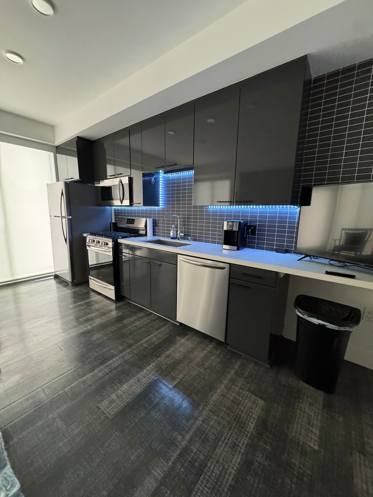 Živite kao legenda u ovom odvažnom, visokom plafonu u potkrovlju DTLA, za razliku od bilo čega što ćete pronaći na drugom mjestu! Duboki plavi zidovi, zavjese od poda do plafona i galerijski zid od preko 30 muzičkih ikona stvaraju čistu Rock ’n’ Roll Green Room Chic. Zlatne i satenske teksture glamuraju spavaću sobu kao da ste u sopstvenoj garderobi iza pozornice, dok kauč na razvlačenje pruža dodatnu udobnost. Pametna tehnologija, bazen na krovu od 360°, kompletna kuhinja, praonica veša i besplatan osigurani parking upotpunjuju vaš vrhunski doživljaj u centru grada.