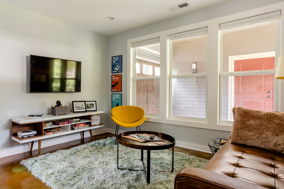 Dobro došli u Mondrian Cottage, svoju jedinstvenu modernu oazu inspirisanu umjetnošću Pijeta Mondriana! Privatno luksuzno skrovište u glavnom Istočnom Nešvilu, puno umetnosti i okruženo bujnim baštama. Lagana, dvospratna, novoizgrađena: kompletna kuhinja i kupatilo, mašina za pranje/sušenje veša, krovni prozori. Koraci od lokalnih prodavnica, barova, restorana i muzičkih lokacija, u mirnoj, istorijskoj stambenoj ulici. Ugodna šetnja do stadiona Nisan; brza vožnja do centra grada i svih atrakcija. Blizu svega i daleko od svega.