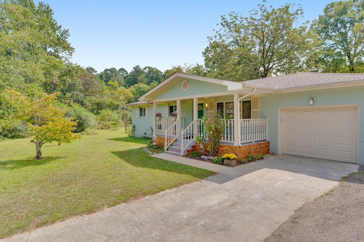 Comfy, cozy, and adorable 60's rancher at the base of Missionary Ridge with a wonderful view of Lookout Mountain. The kitchen is stocked with pots and pans as well as herbs and spices. Close to I-24, Hwy 27, and I-75. Bring the pets and kids! The yard is fenced with a small garden and patio. There's usually a relaxing breeze around the back with a wooded area behind you for a bit of privacy or sit on the front porch and enjoy a beautiful sunset over Lookout Mountain.