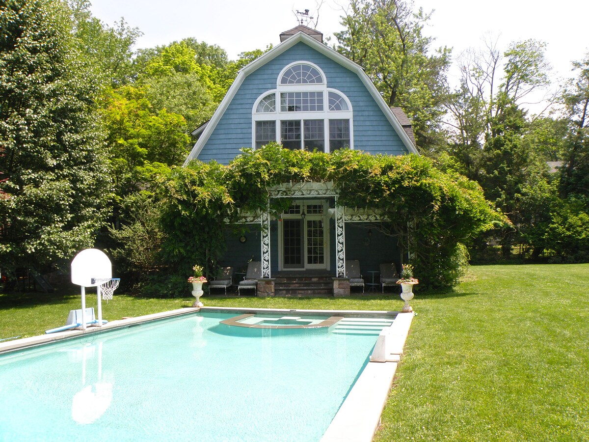 Prostrana eklektična luksuzna renovirana kočija na 1 hektaru sa bazenom i hidromasažnom kadom i zasebnom privatnom hidromasažnom kadom sa 6 sedišta, saunom, parnom sobom, ognjištem na gas i drva, stolom za bazen/ping pong, trampolinom i košarkaškim terenom u predivnom mirnom predgrađu Njujorka. Za 20 minuta možete uživati u svemu što nudi Njujork, a zatim da se vratite na saunu i paru. Odličan mali prostor za okupljanje/intimnu zabavu!