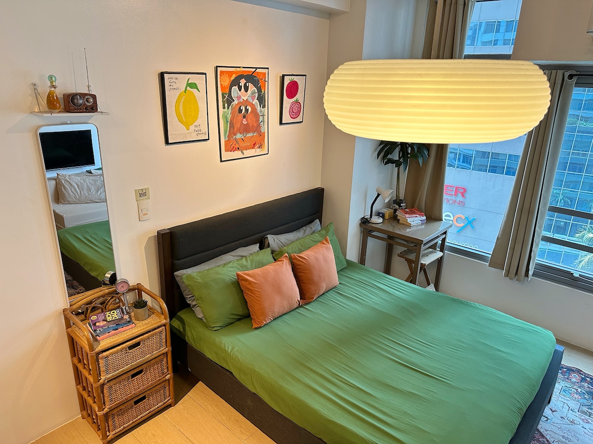 Unwind in this cozy condo unit in the heart of Eastwood, Quezon City. This 36 sqm flat is designed to give ample space for 4 adults w/ kids. It features a fully equipped kitchen w/ refrigerator, microwave, kettle, dinnerware & cookware, allowing guests to cook anytime. It has a queen-sized bed, 2 single beds (in loftbed), semidouble sofa bed & a pull-out. You don’t have to endure floor mattresses. Watch on a 50" 4k UHD TV w/ free WiFi & access to Netflix, Apple TV+or Disney+, HBO,AmazonPrime