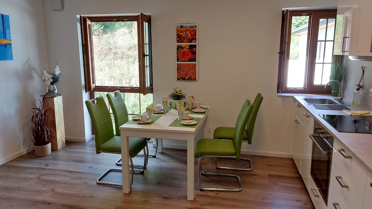 Novouređeni stan sa opremljenom kuhinjom u Herrenmuleu, prizemlje, 2-4 osobe, 1 spavaćom sobom i kaučem na razvlačenje u dnevnoj sobi, koji se nalazi na Schlossbergu s pogledom na dvorac Fridrihštajn, 5 minuta hoda do starog grada, autobus i pekara, besplatan parking, ljekoviti izvori, biciklistička i planinarska staza u neposrednoj blizini, sjedenje na otvorenom.
