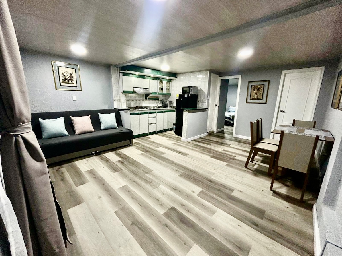 Apartaestudio tipo loft independiente muy tranquilo, en el podrás disfrutar de un smartv 43' con tv cable para ver tus mejores programas, películas o eventos deportivos. La comodidad de una cama king size con sábanas, almohadas, cobijas. Cocina completamente equipada para que prepares tus platos y bebidas favoritas. Baño con agua caliente y para tus horas de trabajo cuentas con escritorio y una silla cómoda, todo esto para una linda experiencia como en casa.